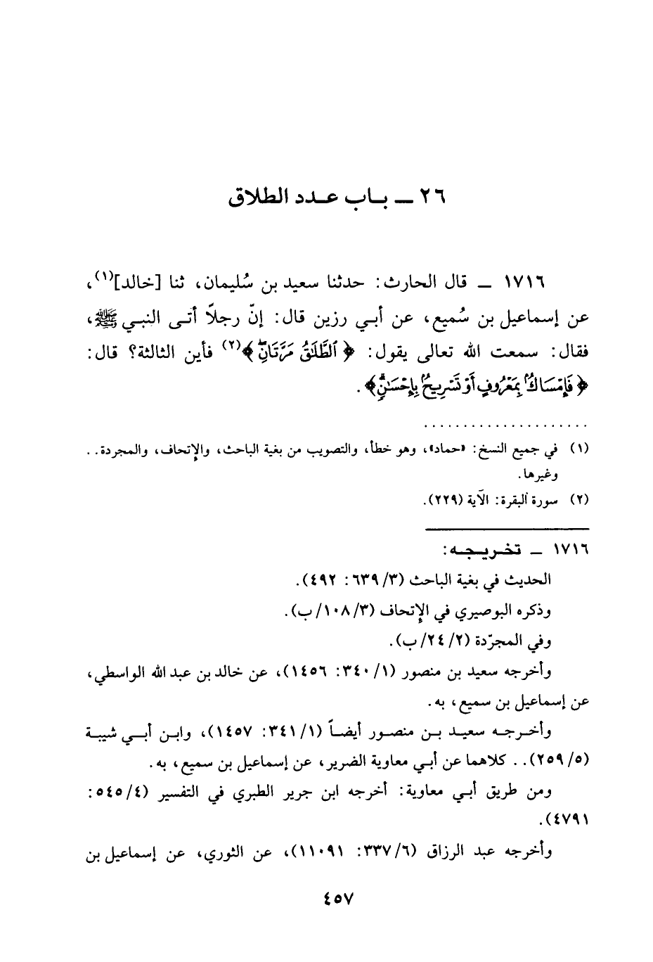 قَالَ الْحَارِثُ حَدَّثَنَا سَعِيدُ بْنُ سليمان ثنا خالد عن اسما عيل بْنِ سميع عن أي رزين قال أَنَّ رَجُلًا أَتَى النَّبِيَّ صَلَّى اللَّهُ عَلَيْهِ وَسَلَّمَ فَقَالَ §سمعت الله تعالى يَقُولُ {الطَّلَاقُ مَرَّتَانِ} فَأَيْنَ الثَّالِثَةُ قَالَ {فَإِمْسَاكٌ بِمَعْرُوفٍ أَوْ تَسْرِيحٌ بِإِحْسَانٍ}