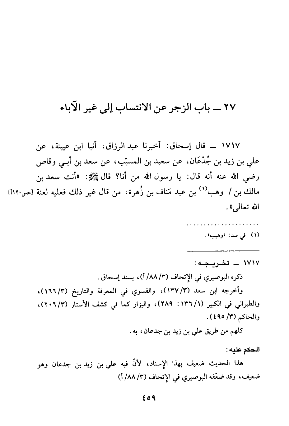 1717 - قَالَ إِسْحَاقُ أَخْبَرَنَا عبد الرزاق انبا ابْنُ عُيَيْنَةَ عَنْ عَلِيِّ بْنِ زَيْدِ بْنِ جُدْعَانَ عَنْ سَعِيدِ بْنِ الْمُسَيِّبِ عَنْ سَعْدِ بْنِ أبي وقاص رَضِيَ الله عَنْه أَنَّهُ قَالَ يَا رَسُولَ اللَّهِ مَنْ أَنَا قال صَلَّى اللَّهُ عَلَيْهِ وَسَلَّمَ انت سعد بْنُ مَالِكِ وهب بن عبد مَنَافِ بْنِ زُهْرَةَ §مَنْ قَالَ غَيْرَ ذَلِكَ فَعَلَيْهِ لعنة الله تعالى
