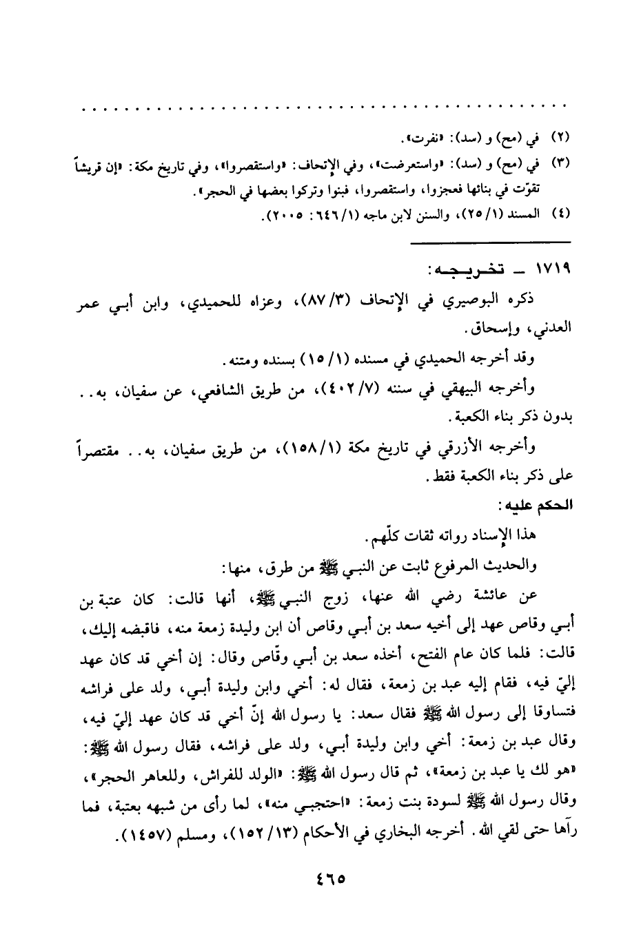 والحديث المرفوع ثابت عَنِ النَّبِيِّ -صَلَّى اللَّهُ عَلَيْهِ وَسَلَّمَ- مَنْ طرق، منها: عن عائشة رضي الله عنها، زَوْجُ النَّبِيِّ -صَلَّى اللَّهُ عَلَيْهِ وَسَلَّمَ-، أَنَّهَا قالت: كان عتبة بن أبي وقاص عهد إلى أخيه سعد بن أبي وقاص أن ابن وليدة زمعة منه، فاقبضه إليك، قالت: فلما كان عام الفتح، أخذه سعد بن أبي وقّاص وقال: إن أخي قد كان عهد إليّ فيه، فقام إليه عبد بن زمعة، فقال له: أخي وابن وليدة أبي، ولد على فراشه فتساوقا إلى رسول الله -صلى الله عليه وسلم- فقال سعد: يا رسول الله إن أخي قد كان عهد إليّ فيه، وقال عبد بن زمعة: أخي وابن وليدة أبي، ولد على فراشه، فَقَالَ رَسُولُ اللَّهِ -صَلَّى اللَّهُ عَلَيْهِ وَسَلَّمَ-: "هو لك يا عبد بن زمعة"، ثُمَّ قَالَ رَسُولُ اللَّهِ -صَلَّى اللَّهُ عَلَيْهِ وسلم-: "الولد للفراش، وللعاهر الحجر"، وَقَالَ رَسُولُ اللَّهِ -صَلَّى اللَّهُ عَلَيْهِ وَسَلَّمَ- لسودة بنت زمعة: "احتجبي منه" , لما رأى من شبهه بعتبة، فما رآها حتى لقي الله. أخرجه البخاري في الأحكام (13/ 152)، ومسلم (1457).