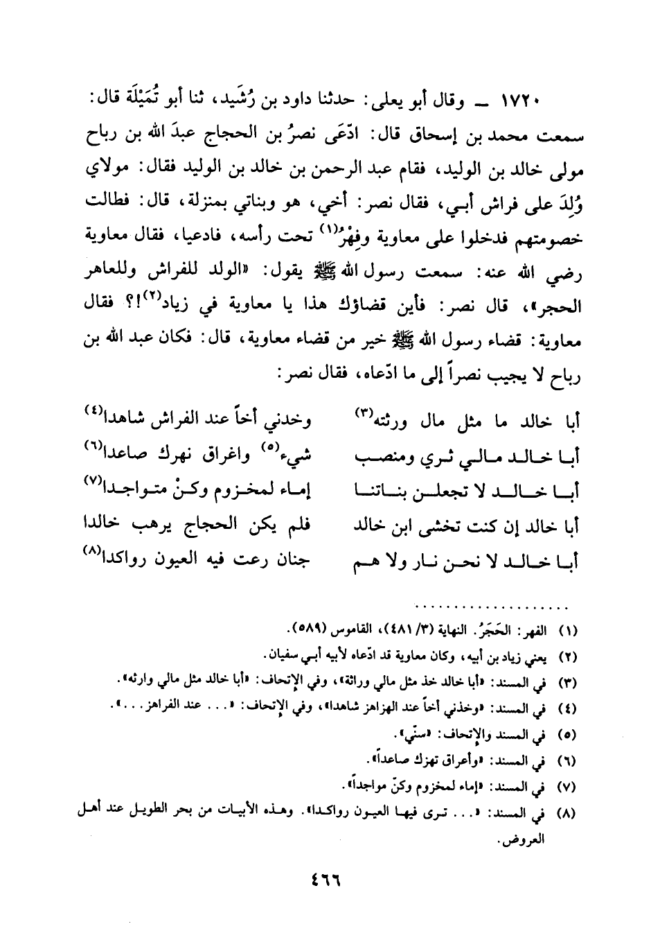 1720 - وَقَالَ أَبُو يَعْلَى حَدَّثَنَا دَاوُدُ بْنُ رُشَيْدٍ ثنا أَبُو تميلة قال سَمِعْتُ مُحَمَّدَ بْنَ إِسْحَاقَ قَالَ ادَّعَى نَصْرُ بْنُ الْحَجَّاجِ عَبْدَ اللَّهِ بْنَ رَبَاحٍ مَوْلَى خَالِدِ بْنِ الْوَلِيدِ فَقَامَ عَبْدُ الرَّحْمَنِ بن خالد بن الوليد فَقَالَ مَوْلَايَ وُلِدَ عَلَى فِرَاشِ أَبِي فَقَالَ نَصْرٌ أَخِي هُوَ وَبَنَاتِي بِمَنْزِلَةٍ قَالَ فَطَالَتْ خُصُومَتُهُمْ فَدَخَلُوا عَلَى مُعَاوِيَةَ وَفِهْرٌ تَحْتَ رَأْسِهِ فَادَّعَيَا فقال معاوية رَضِيَ الله عَنْه سَمِعْتُ رَسُولَ اللَّهِ صَلَّى اللَّهُ عَلَيْهِ وَسَلَّمَ يَقُولُ §الْوَلَدُ لِلْفِرَاشِ وَلِلْعَاهِرِ الْحَجَرُ قَالَ نَصْرٌ فَأَيْنَ قَضَاؤُكَ هَذَا يَا مُعَاوِيَةُ فِي زِيَادٍ فَقَالَ مُعَاوِيَةُ قَضَاءُ رَسُولِ اللَّهِ صَلَّى اللَّهُ عَلَيْهِ وَسَلَّمَ خَيْرٌ مِنْ قضاء معاوية قال فَكَانَ عَبْدُ اللَّهِ بْنُ رَبَاحٍ لَا يُجِيبُ نَصْرًا إِلَى مَا ادَّعَاهُ فَقَالَ نَصْرٌ