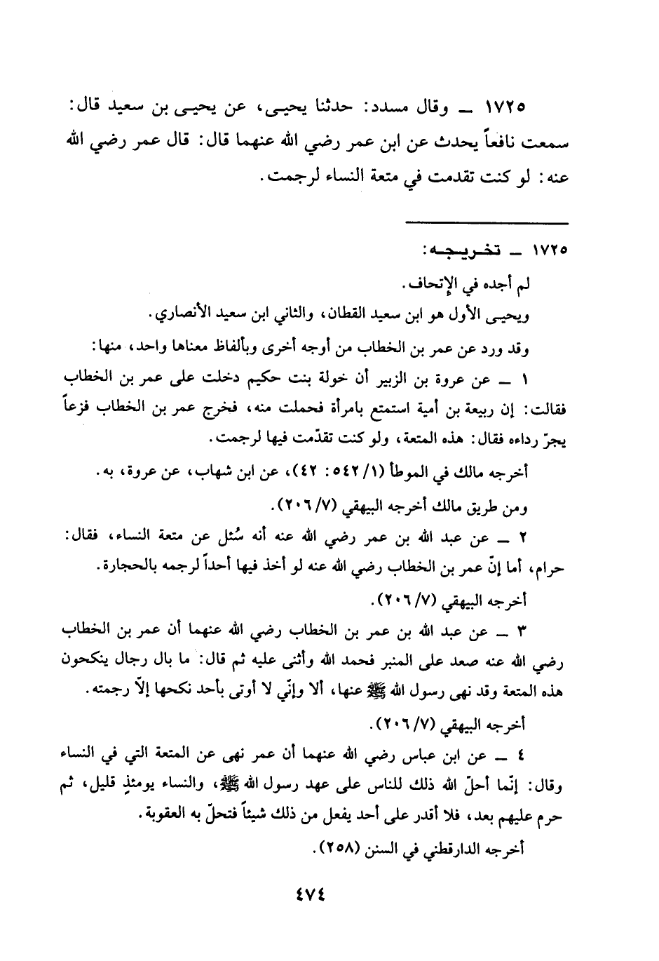 1725 - وَقَالَ مُسَدَّدٌ حَدَّثَنَا يَحْيَى عَنْ يَحْيَى بْنِ سَعِيدٍ قَالَ سَمِعْتُ نَافِعًا يُحَدِّثُ عَنِ ابن عمر رَضِيَ الله عَنْهما قَالَ قال عمر رَضِيَ الله عَنْه §لَوْ كُنْتُ تَقَدَّمْتُ فِي مُتْعَةِ النِّسَاءِ لَرَجَمْتُ