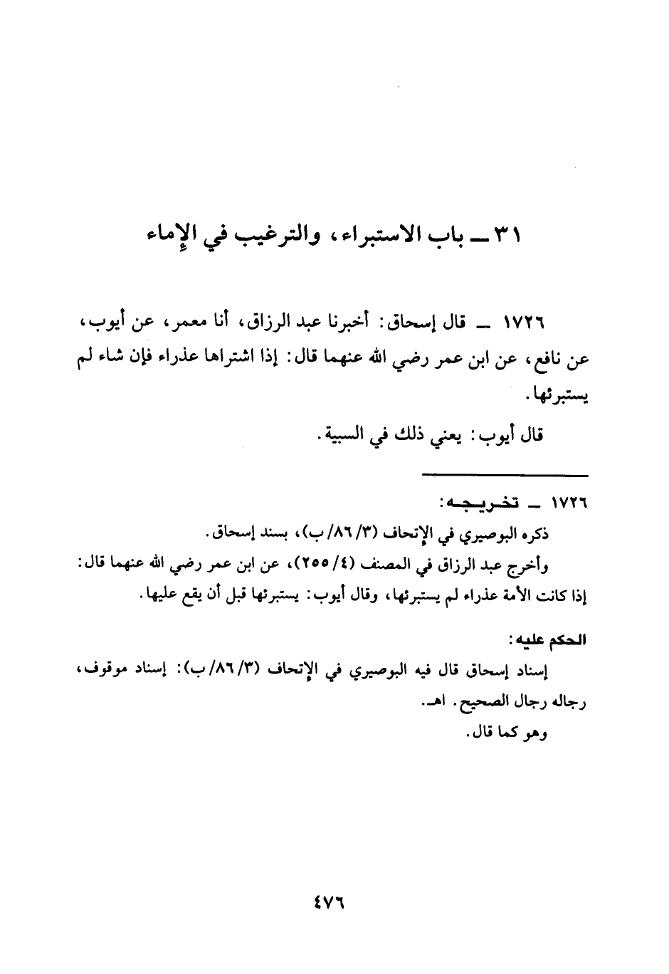 1726 - قَالَ إِسْحَاقُ أَخْبَرَنَا عَبْدُ الرَّزَّاقِ أنا مَعْمَرٌ عَنْ أَيُّوبَ عَنْ نَافِعٍ عَنِ ابن عمر رَضِيَ الله عَنْهما قَالَ §إِذَا اشْتَرَاهَا عَذْرَاءَ فَإِنْ شَاءَ لَمْ يَسْتَبْرِئْهَا قَالَ أَيُّوبَ يَعْنِي ذَلِكَ فِي السبية