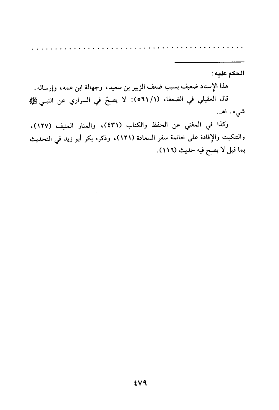 وكذا في المغني عن الحفظ والكتاب (431)، والمنار المنيف (127)، والتنكيت والإفادة على خاتمة سفر السعادة (121)، وذكره بكر أبو زيد في التحديث بما قيل لا يصح فيه حديث (116).