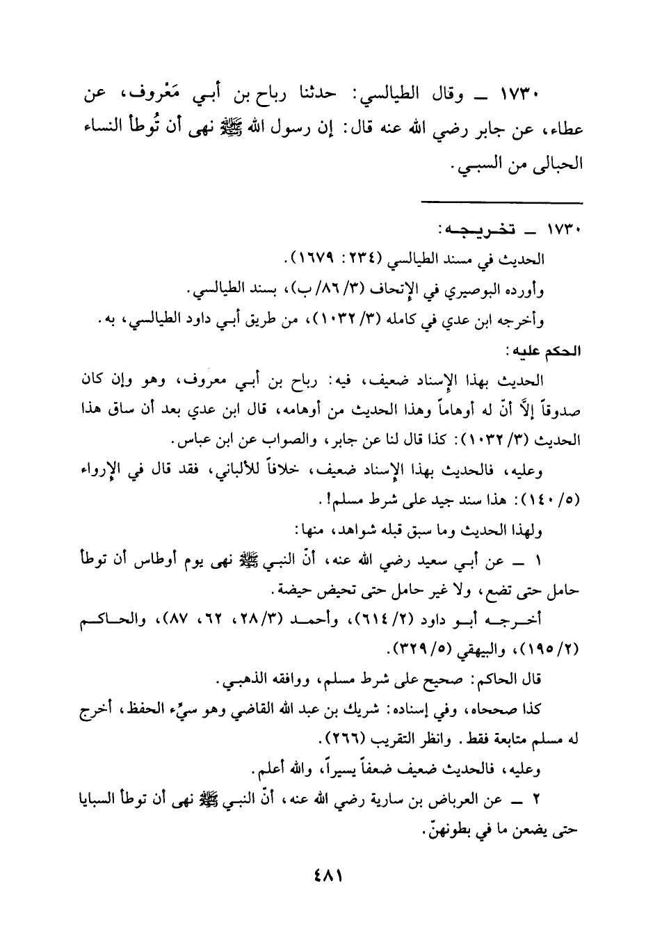 1730 - وَقَالَ الطَّيَالِسِيُّ حَدَّثَنَا رَبَاحُ بْنُ أَبِي مَعْرُوفٍ عَنْ عَطَاءٍ عن جابر رَضِيَ الله عَنْه قال أَنَّ رَسُولَ اللَّهِ صَلَّى اللَّهُ عَلَيْهِ وَسَلَّمَ §نَهَى أَنْ تُوطَأَ النِّسَاءُ الْحَبَالَى مِنَ السَّبْيِ