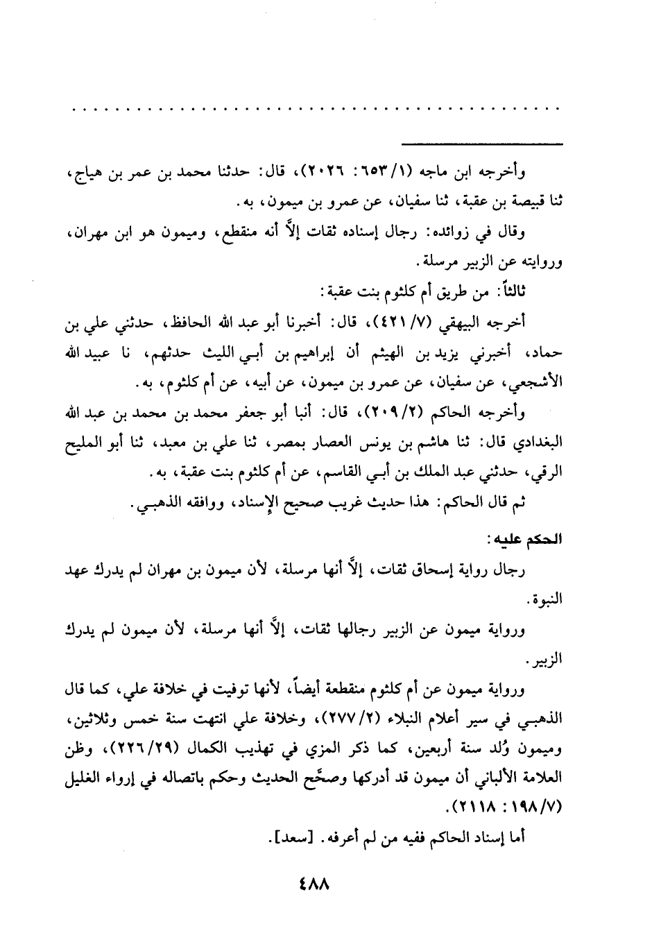 ورواية ميمون عن أم كلثوم منقطعة أيضًا , لأنها توفيت في خلافة علي، كما قال الذهبي في سير أعلام النبلاء (2/ 277)، وخلافة علي انتهت سنة خمس وثلاثين، وميمون وُلد سنة أربعين، كما ذكر المزي في تهذيب الكمال (29/ 226)، وظن العلامة الألباني أن ميمون قد أدركها وصحَّح الحديث وحكم باتصاله في إرواء الغليل (7/ 198: 2118).