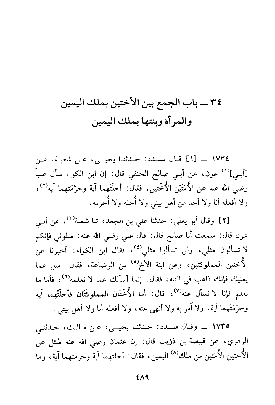 وَقَالَ مُسَدَّدٌ حَدَّثَنَا يَحْيَى عن مالك حدثني الزُّهْرِيِّ عَنْ قَبِيصَةَ بن ذؤيب قال أن عثمان رَضِيَ الله عَنْه سُئِلَ عَنِ الْأُخْتَيْنِ الْأَمَتَيْنِ مِنْ مِلْكِ الْيَمِينِ فَقَالَ §أَحَلَّتْهُمَا آيَةٌ وَحَرَّمَتْهُمَا آيَةٌ وَمَا