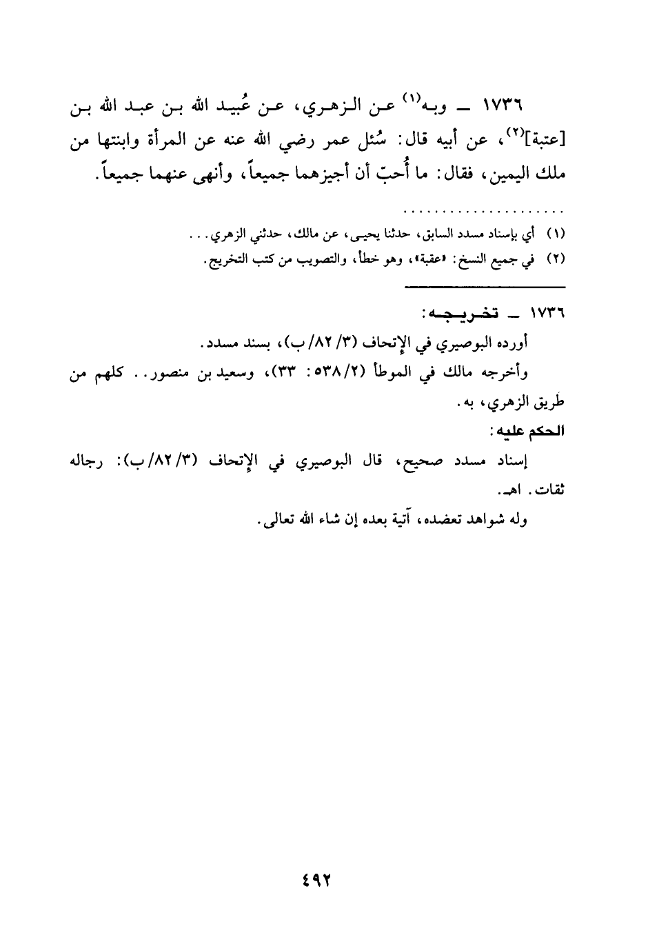 1736 - وَبِهِ عَنِ الزُّهْرِيِّ عَنْ عُبَيْدِ اللَّهِ بْنِ عَبْدِ اللَّهِ بْنِ عُتْبَةَ عن أبيه قال سئل عمر رَضِيَ الله عَنْه عَنْ الْمَرْأَةِ وَابْنَتِهَا مِنْ مِلْكِ الْيَمِينِ فَقَالَ §مَا أُحِبُّ أَنْ اجيزها جَمِيعًا وَأَنْهَى عَنْهُمَا جَمِيعًا