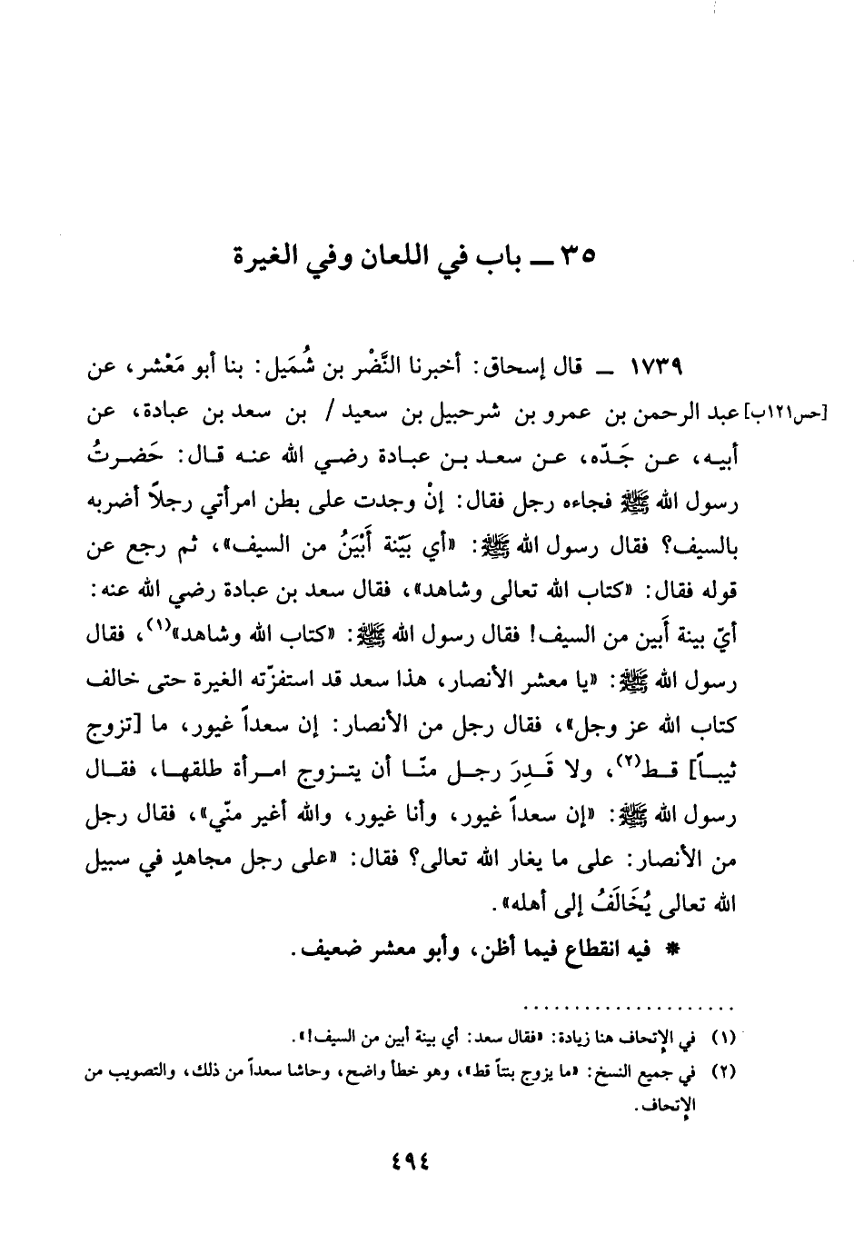 1739 - قَالَ إِسْحَاقُ أَخْبَرَنَا النَّضْرُ بن شميل بنا أَبُو مَعْشَرٍ عن عبد الرحمن بْنِ عَمْرِو بْنِ شُرَحْبِيلَ بْنِ سَعِيدِ بْنِ سَعْدِ بْنِ عُبَادَةَ عَنْ أَبِيهِ عَنْ جَدِّهِ عَنْ سَعْدِ بن عبادة رَضِيَ الله عَنْه قَالَ حَضَرْتُ رَسُولَ اللَّهِ صَلَّى اللَّهُ عَلَيْهِ وَسَلَّمَ فَجَاءَهُ رَجُلٌ فَقَالَ إِنْ وَجَدْتُ عَلَى بَطْنِ امْرَأَتِي رَجُلًا أَضْرِبُهُ بِالسَّيْفِ فَقَالَ رَسُولُ اللَّهِ صَلَّى اللَّهُ عَلَيْهِ وَسَلَّمَ أَيُّ بَيِّنَةٍ أَبْيَنُ مِنَ السَّيْفِ ثُمَّ رَجَعَ عَنْ قَوْلِهِ فَقَالَ كتاب الله تعالى وَشَاهِدٌ فَقَالَ سَعْدُ بن عبادة رَضِيَ الله عَنْه أَيُّ بَيِّنَةٍ أَبْيَنُ مِنَ السَّيْفِ فَقَالَ رَسُولُ اللَّهِ صَلَّى اللَّهُ عَلَيْهِ وَسَلَّمَ كِتَابُ اللَّهِ وَشَاهِدٌ فَقَالَ رَسُولُ اللَّهِ صَلَّى اللَّهُ عَلَيْهِ وَسَلَّمَ يَا مَعْشَرَ الْأَنْصَارِ هَذَا سَعْدٌ قَدِ اسْتَفَزَّتْهُ الْغَيْرَةُ حَتَّى خَالَفَ كتاب الله عز وجل فَقَالَ مِنَ الْأَنْصَارِ §إِنَّ سَعْدًا غَيُورٌ مَا تَزَوَّجَ ثَيِّبًا قَطُّ وَلَا قَدَرَ رَجُلٌ مِنَّا أَنْ يَتَزَوَّجَ امْرَأَةً طَلَّقَهَا فَقَالَ رَسُولُ اللَّهِ صَلَّى اللَّهُ عَلَيْهِ وَسَلَّمَ إِنَّ سَعْدًا غَيُورٌ وَأَنَا غَيُورٌ وَاللَّهُ أَغْيَرُ مِنِّي فَقَالَ رَجُلٌ مِنَ الأنصار على ما يغار الله تعالى فَقَالَ عَلَى رَجُلٍ مُجَاهِدٍ فِي سبيل الله تعالى يُخَالَفُ إِلَى أَهْلِهِ