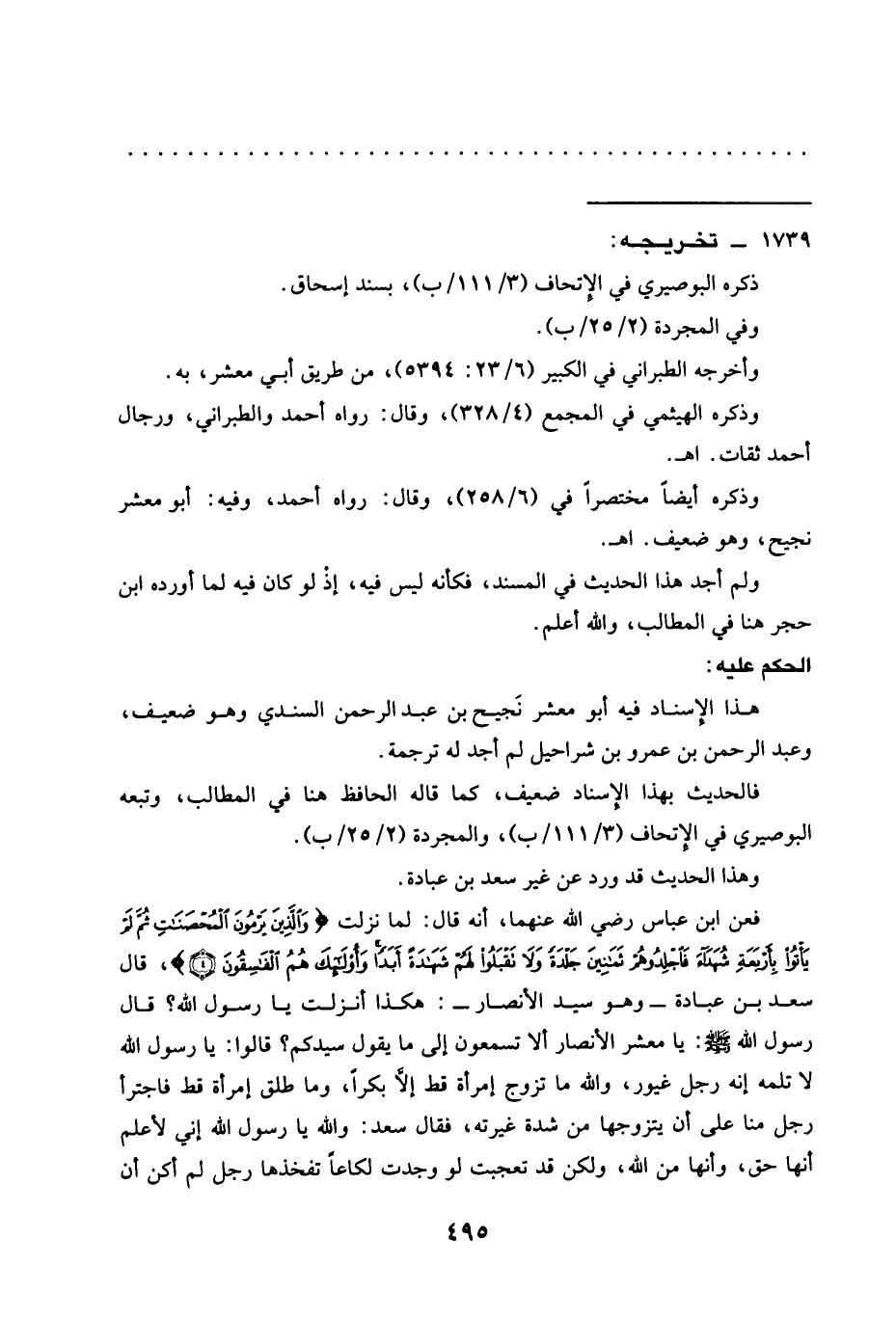 فعن ابن عباس رضي الله عنهما، أنه قال: لما نزلت {وَالَّذِينَ يَرْمُونَ الْمُحْصَنَاتِ ثُمَّ لَمْ يَأْتُوا بِأَرْبَعَةِ شُهَدَاءَ فَاجْلِدُوهُمْ ثَمَانِينَ جَلْدَةً وَلَا تَقْبَلُوا لَهُمْ شَهَادَةً أَبَدًا وَأُولَئِكَ هُمُ الْفَاسِقُونَ (4)}، قال سعد بن عبادة -وهو سيد الأنصار-: هكذا أنزلت يَا رَسُولَ اللَّهِ؟ قَالَ رَسُولُ اللَّهِ -صَلَّى الله عليه وسلم-: يا معشر الأنصار ألا تسمعون إلى ما يقول سيدكم؟ قالوا: يا رسول الله لا تلمه إنه رجل غيور، والله ما تزوج إمرأة قط إلَّا بكرًا، وما طلق إمرأة قط فاجترأ رجل منا على أن يتزوجها من شدة غيرته، فقال سعد: والله يا رسول الله إني لأعلم أنها حق، وأنها من الله، ولكن قد تعجبت لو وجدت لكاعًا تفخذها رجل لم أكن أن =