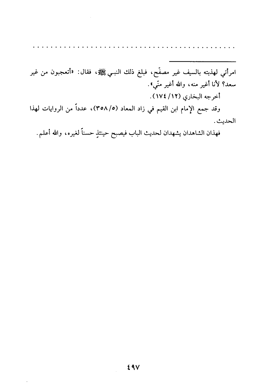 = امرأتي لهذبته بالسيف غير مصفّح، فَبَلَغَ ذَلِكَ النَّبِيَّ -صَلَّى اللَّهُ عَلَيْهِ وَسَلَّمَ-، فقال: "أتعجبون من غيرة سعد؟ لأنا أغير منه، والله أغير مني".