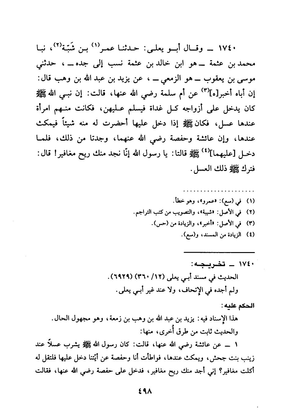 1740 - وَقَالَ أَبُو يعلى حدثنا عُمَرُ بْنُ شبة نبا مُحَمَّدُ بْنُ عَثْمَةَ هُوَ ابْنُ خَالِدِ بن عثمة نسب إِلَى جَدِّهِ حَدَّثَنِي مُوسَى بْنُ يَعْقُوبَ هُوَ الزَّمْعِيُّ عَنْ يَزِيدَ بْنِ عَبْدِ اللَّهِ بن وهب قال أَنَّ أَبَاهُ أَخْبَرَهُ عَنْ أم سلمة رَضِيَ الله عَنْها قالت أَنَّ نَبِيَّ اللَّهِ صَلَّى اللَّهُ عَلَيْهِ وَسَلَّمَ §كَانَ يَدْخُلُ عَلَى أَزْوَاجِهِ كُلَّ غَدَاةٍ فَيُسَلِّمُ عَلَيْهِنَّ فَكَانَتْ منهم امْرَأَةٌ عِنْدَهَا عَسَلٌ فَكَانَ صَلَّى اللَّهُ عَلَيْهِ وَسَلَّمَ إِذَا دَخَلَ عَلَيْهَا أَحَضَرَتْ لَهُ مِنْهُ شَيْئًا فَيَمْكُثُ عِنْدَهَا وَإِنَّ عائشة وحفصة رَضِيَ الله عَنْهما وَجَدَتَا مِنْ ذَلِكَ فَلَمَّا دَخَلَ عَلَيْهِمَا صَلَّى اللَّهُ عَلَيْهِ وَسَلَّمَ قَالَتَا يَا رسول الله إن نَجِدُ مِنْكَ رِيحَ مَغَافِيرَ قَالَ فَتَرَكَ صَلَّى اللَّهُ عَلَيْهِ وَسَلَّمَ ذَلِكَ الْعَسَلَ