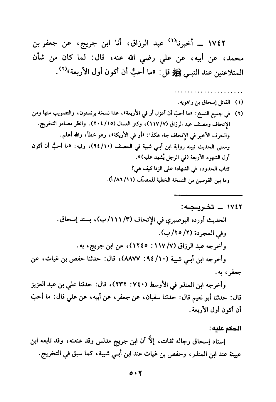 1742 - أَخْبَرَنَا عَبْدُ الرَّزَّاقِ أنا ابْنُ جُرَيْجٍ عن جعفر بن محمد عَنْ أَبِيهِ عن علي رَضِيَ الله عَنْه قَالَ لَمَّا كَانَ مِنْ شَأْنِ المتلاعتين عند النبي صَلَّى اللَّهُ عَلَيْهِ وَسَلَّمَ قل §مَا أُحِبُّ أَنْ أَكُونَ أَوَّلَ الْأَرْبَعَةِ