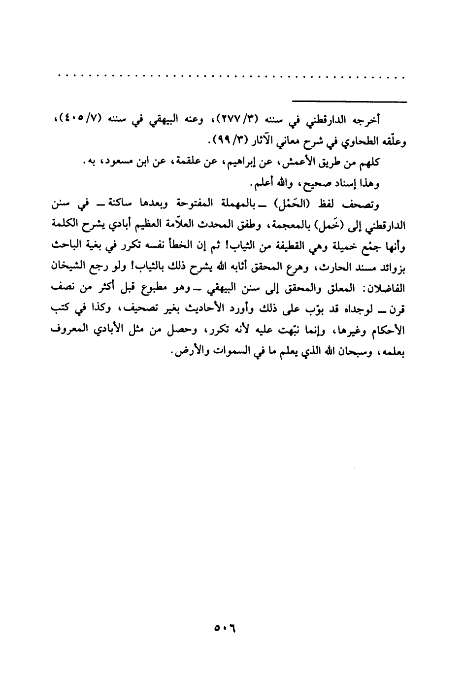 وتصحف لفظ (الحَمْل) -بالمهملة المفتوحة وبعدها ساكنة- في سنن الدارقطني إلى (خَمل) بالمعجمة، وطفق المحدث العلاّمة العظيم أبادي يشرح الكلمة وأنها جمْع خميلة وهي القطيفة من الثياب! ثم إن الخطأ نفسه تكرر في بغية الباحث بزوائد مسند الحارث، وهرع المحقق أثابه الله يشرح ذلك بالثياب! ولو رجع الشيخان الفاضلان: المعلق والمحقق إلى سنن البيهقي -وهو مطبوع قبل أكثر من نصف قرن- لوجداه قد بوّب على ذلك وأورد الأحاديث بغير تصحيف، وكذا في كتب الأحكام وغيرها، وإنما نبّهت عليه لأنه تكرر، وحصل من مثل الأبادي المعروف بعلمه، وسبحان الله الذي يعلم ما في السموات والأرض.