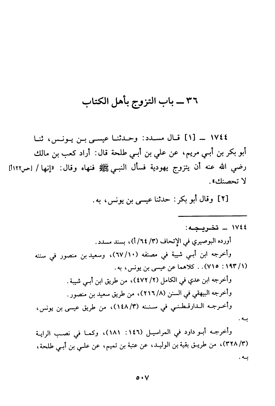 1744 - قال مُسَدَّدٌ وحدثنا عِيسَى بْنُ يُونُسَ ثنا أَبُو بَكْرِ بْنُ أَبِي مَرْيَمَ عَنْ عَلِيِّ بْنِ أَبِي طَلْحَةَ قَالَ أَرَادَ كَعْبُ بن مالك رَضِيَ الله عَنْه أَنْ يَتَزَوَّجَ يَهُودِيَّةً فَسَأَلَ النَّبِيَّ صَلَّى اللَّهُ عَلَيْهِ وَسَلَّمَ فَنَهَاهُ وَقَالَ §إِنَّهَا لَا تُحْصِنُكَ