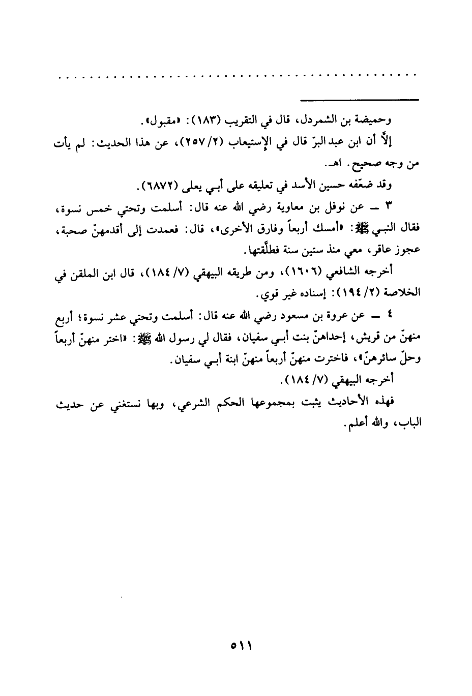 3 - عن نوفل بن معاوية رضي الله عنه قال: أسلمت وتحتي خمس نسوة، فقال النبي -صلي الله عليه وسلم-:"أمسك أربعًا وفارق الأخرى"، قال: فعمدت إلى أقدمهن صحبة، عجوز عاقر، معي منذ ستين سنة فطلَّقتها.