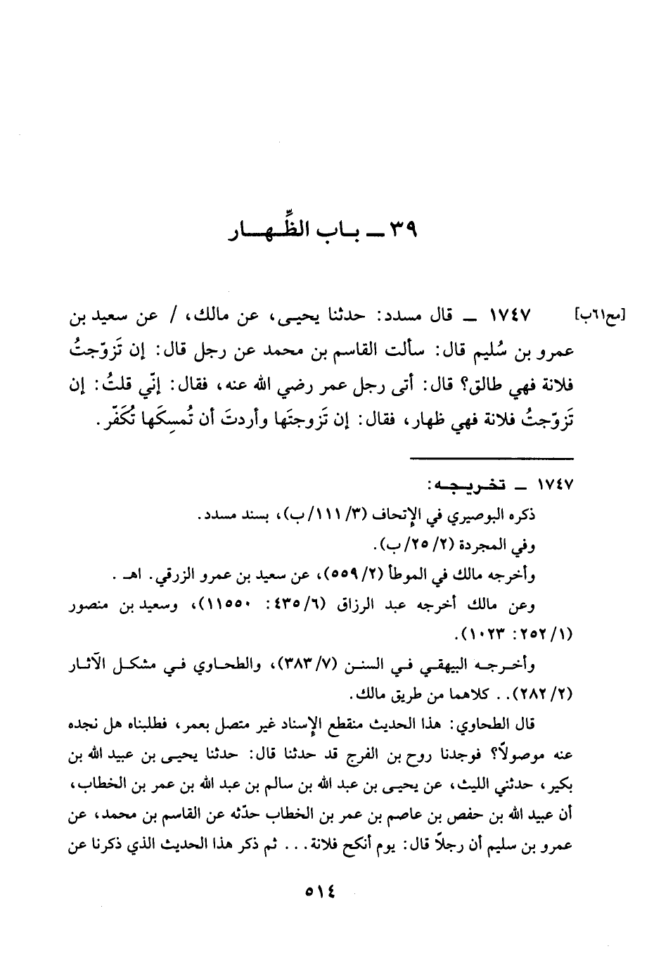 1747 - قَالَ مُسَدَّدٌ حَدَّثَنَا يَحْيَى عَنْ مَالِكٍ عَنْ سَعِيدِ بْنِ عَمْرِو بْنِ سليم قال سَأَلْتُ الْقَاسِمَ مُحَمَّدٍ عَنْ رَجُلٍ قَالَ §إِنْ تَزَوَّجْتُ فُلَانَةَ فَهِيَ طالق قال أت رجل عمر رَضِيَ الله عَنْه فَقَالَ إِنِّي قُلْتُ إِنْ تَزَوَّجْتُ فُلَانَةَ فَهِيَ ظِهَارٌ فَقَالَ إِنْ تَزَوَّجْتَهَا وَأَرَدْتَ أن تمسكها تكفر -[516]-