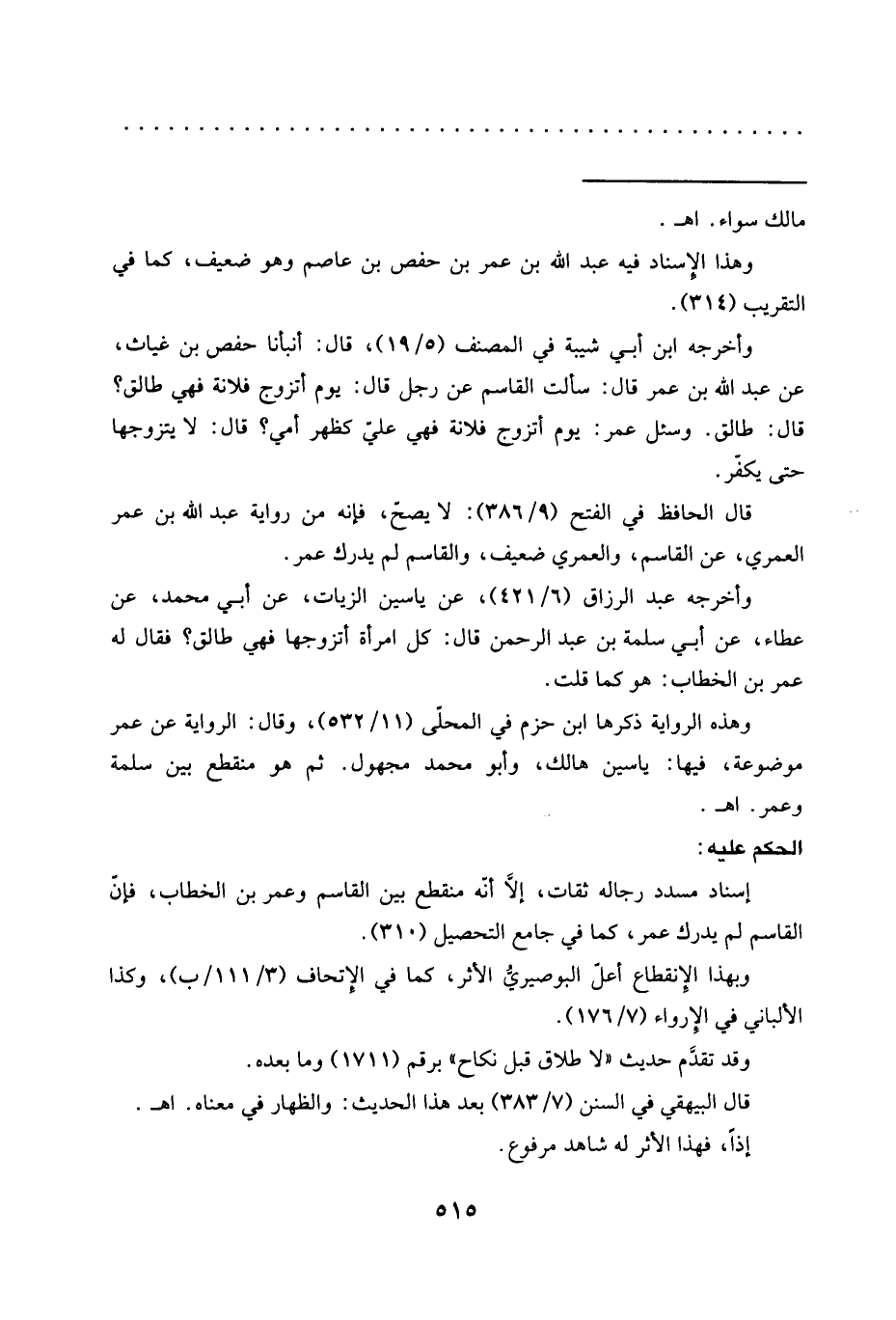 وأخرجه ابن أبي شيبة في المصنف (5/ 19)، قال: أنبأنا حَفْصُ بْنُ غِيَاثٍ، عَنْ عَبْدِ اللَّهِ بْنِ عمر قال: سألت القاسم عن رجل قال: يوم أتزوج فلانة فهي طالق؟ قال: طالق. وسئل عمر: يوم أتزوج فلانة فهي عليّ كظهر أمي؟ قال: لا يتزوجها حتى يكفّر.