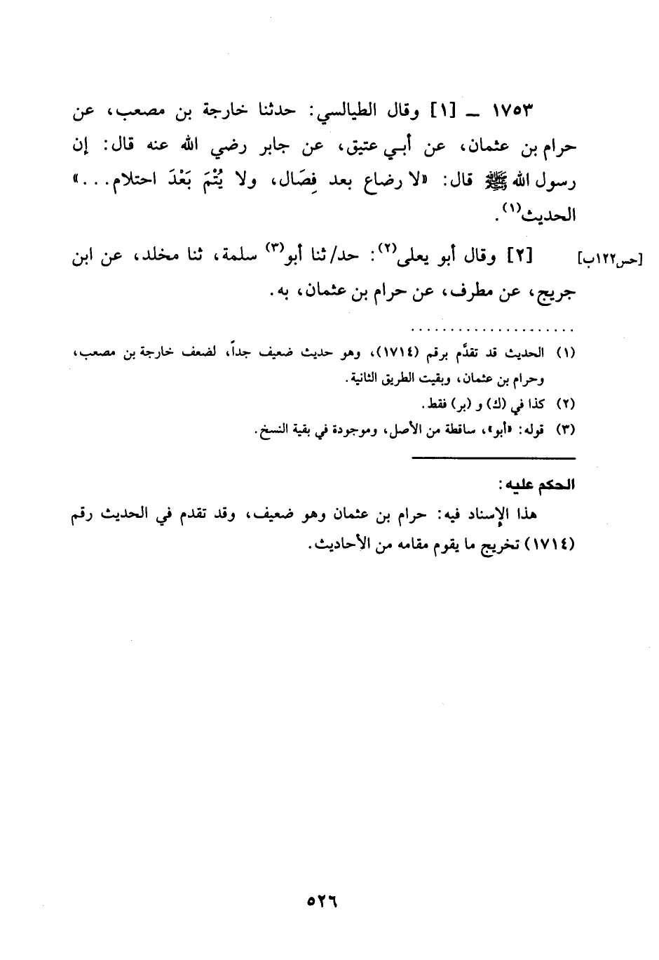 1753 - وَقَالَ الطَّيَالِسِيُّ حَدَّثَنَا خَارِجَةُ بْنُ مُصْعَبٍ عَنْ حَرَامِ بْنِ عُثْمَانَ عَنِ أَبِي عَتِيقٍ عن جابر رَضِيَ الله عَنْه قال أَنَّ رَسُولَ اللَّهِ صَلَّى اللَّهُ عَلَيْهِ وَسَلَّمَ قَالَ §لَا رَضَاعَ بَعْدَ فِصَالٍ وَلَا يُتْمَ بَعْدَ احْتِلَامٍ الْحَدِيثَ