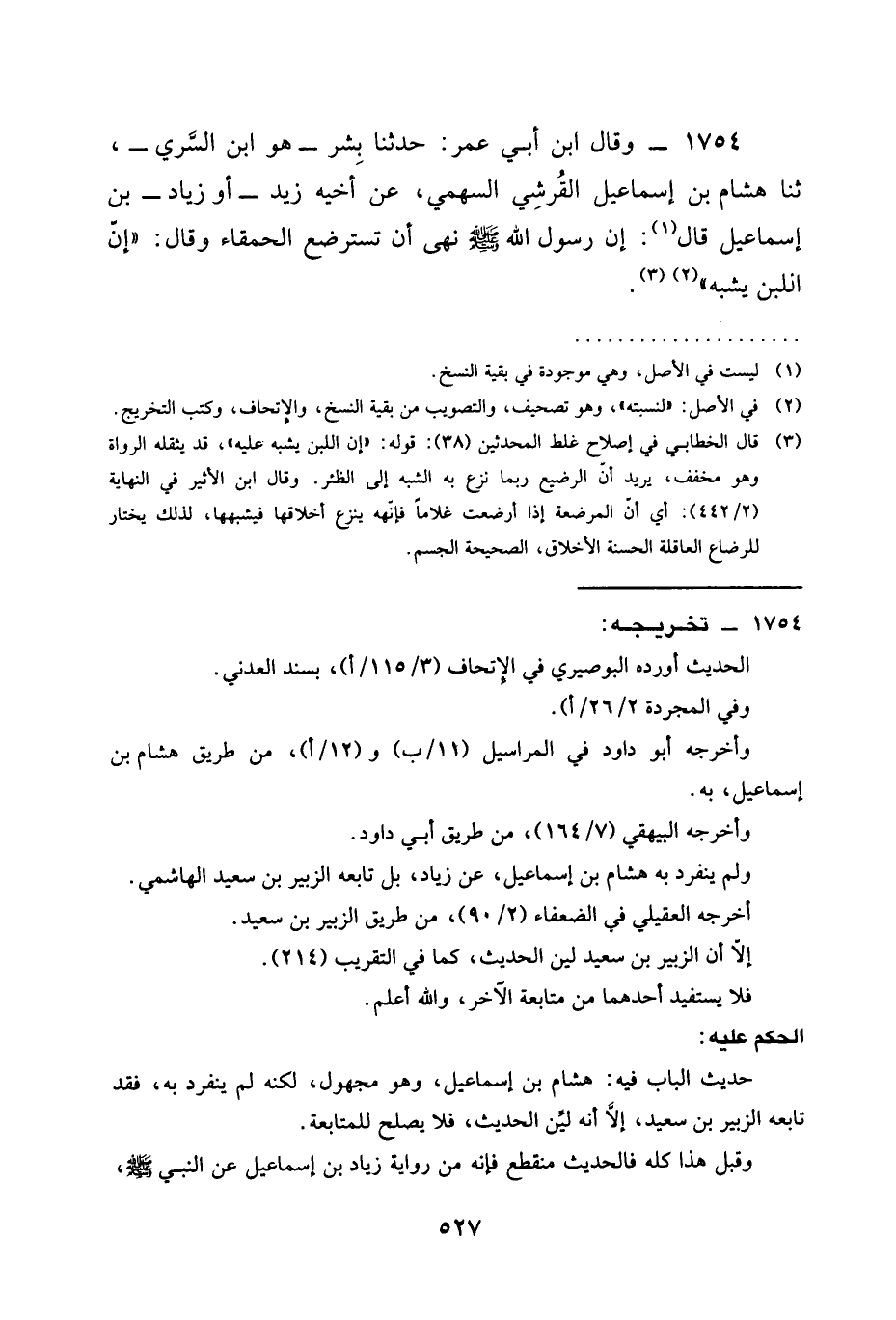 1754 - وَقَالَ ابْنُ أَبِي عُمَرَ حَدَّثَنَا بِشْرٌ هُوَ ابْنُ السَّرِيِّ ثنا هِشَامُ بْنُ إِسْمَاعِيلَ الْقُرَشِيُّ السَّهْمِيُّ عَنْ أَخِيهِ زَيْدٍ أَوْ زِيَادِ بْنِ إِسْمَاعِيلَ قال أن رسول الله صَلَّى اللَّهُ عَلَيْهِ وَسَلَّمَ §نَهَى أَنْ تُسْتَرْضَعَ الْحَمْقَاءُ وَقَالَ إِنَّ اللَّبَنَ يُشْبِهُ