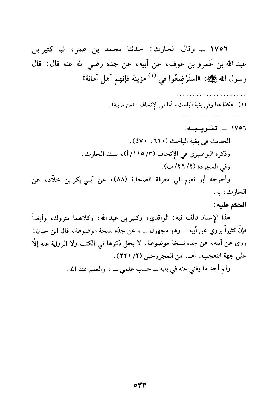 1756 - وَقَالَ الْحَارِثُ حَدَّثَنَا مُحَمَّدُ بن عمر نبا كَثِيرُ بْنُ عَبْدِ اللَّهِ بْنِ عَمْرِو بْنِ عوف عن أبي عن جده رَضِيَ الله عَنْه قَالَ قَالَ رَسُولُ اللَّهِ صَلَّى اللَّهُ عَلَيْهِ وَسَلَّمَ §اسْتَرْضِعُوا فِي مُزَيْنَةَ فَإِنَّهُمْ أَهْلُ أَمَانَةٍ
