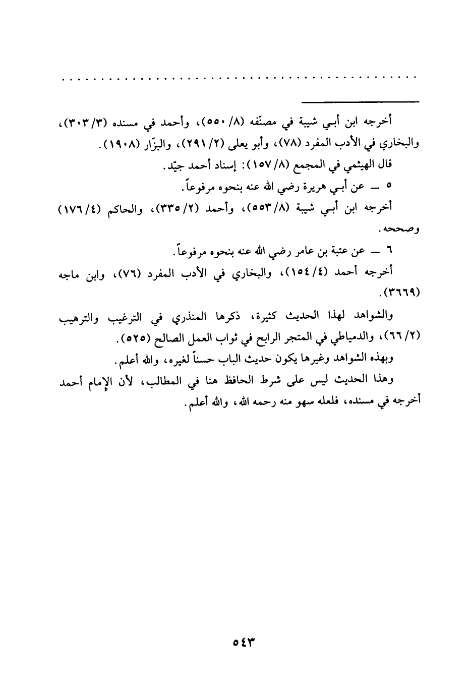 وهذا الحديث ليس على شرط الحافظ هنا في المطالب, لأن الإِمام أحمد أخرجه في مسنده , فلعله سهو منه رحمه الله، والله أعلم.