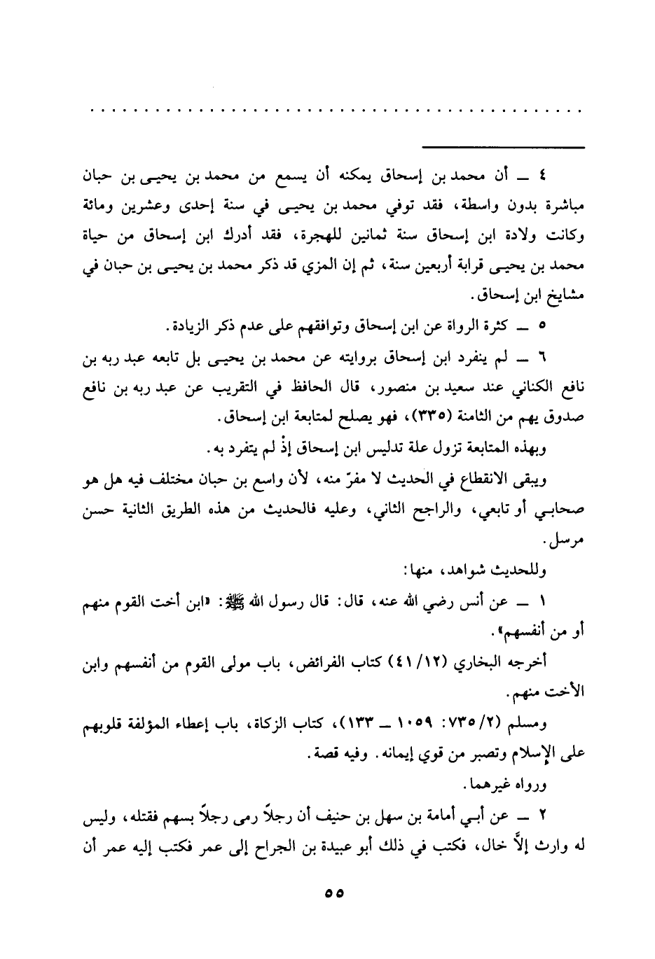 = 4 - أن محمد بن إسحاق يمكنه أن يسمع من محمد بن يحيى بن حبان مباشرة بدون واسطة، فقد توفي محمد بن يحيى في سنة إحدى وعشرين ومائة وكانت ولادة ابن إسحاق سنة ثمانين للهجرة، فقد أدرك ابن إسحاق من حياة محمد بن يحيى قرابة أربعين سنة، ثم إن المزي قد ذكر محمد بن يحيى بن حبان في مشايخ ابن إسحاق.