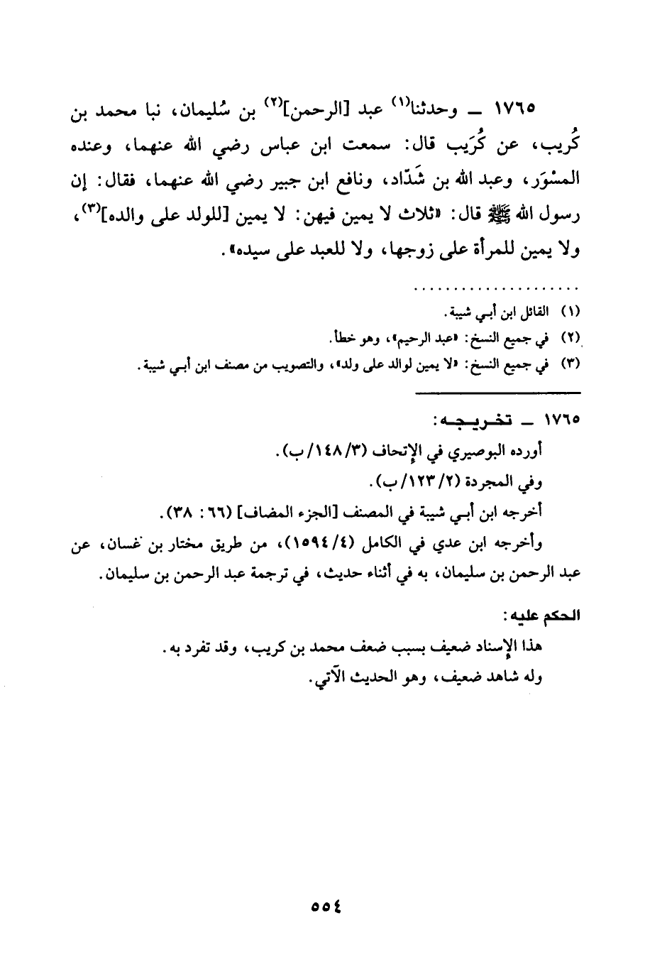 1765 - وحدثنا عَبْدُ الرحمن بْنُ سُلَيْمَانَ نبا مُحَمَّدُ بْنُ كُرَيْبٍ عن كريب قَالَ سَمِعْتُ ابْنَ عَبَّاسٍ رَضِيَ الله عَنْهما وَعِنْدَهُ الْمِسْوَرُ وَعَبْدُ اللَّهِ بْنُ شَدَّادٍ وَنَافِعُ ابن جبير رَضِيَ الله عَنْهما فَقَالَ إِنَّ رَسُولَ اللَّهِ صَلَّى اللَّهُ عَلَيْهِ وَسَلَّمَ قَالَ §ثَلَاثٌ لَا يَمِينَ فِيهِنَّ لَا يَمِينَ لِلْوَلَدِ عَلَى وَالِدِهِ وَلَا يَمِينَ لِلْمَرْأَةِ عَلَى زَوْجِهَا وَلَا لِلْعَبْدِ عَلَى سَيِّدِهِ