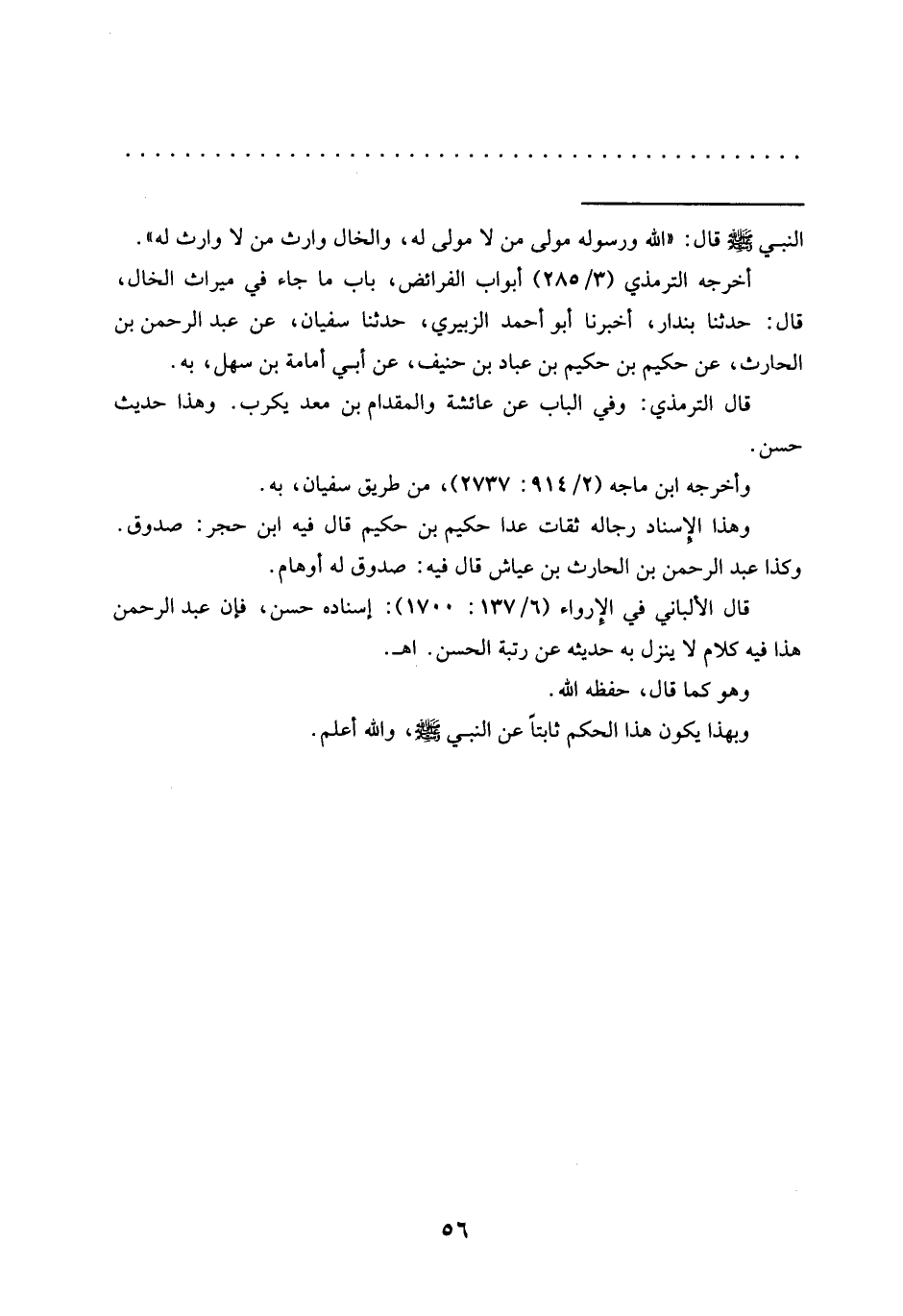 = النَّبِيِّ -صَلَّى اللَّهُ عَلَيْهِ وَسَلَّمَ- قَالَ: "اللَّهَ ورسوله مولى من لا مولى له، والخال وارث من لا وارث له".