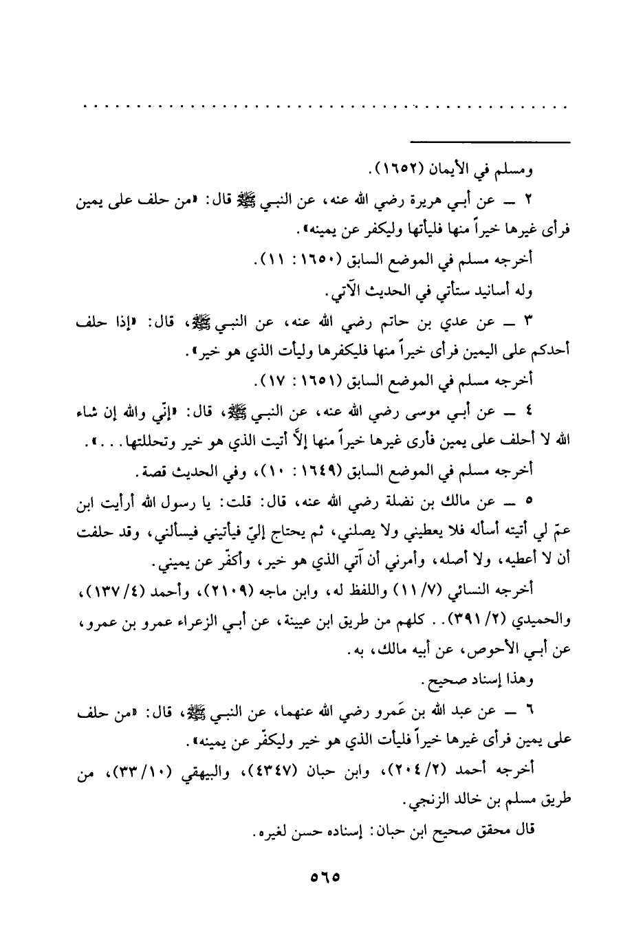 2 - عَنْ أَبِي هُرَيْرَةَ رَضِيَ اللَّهُ عَنْهُ، عَنِ النَّبِيِّ -صَلَّى اللَّهُ عَلَيْهِ وَسَلَّمَ- قَالَ: "من حَلَفَ عَلَى يَمِينٍ فَرَأَى غَيْرَهَا خَيْرًا مِنْهَا فليأتها وليكفر عن يمينه".