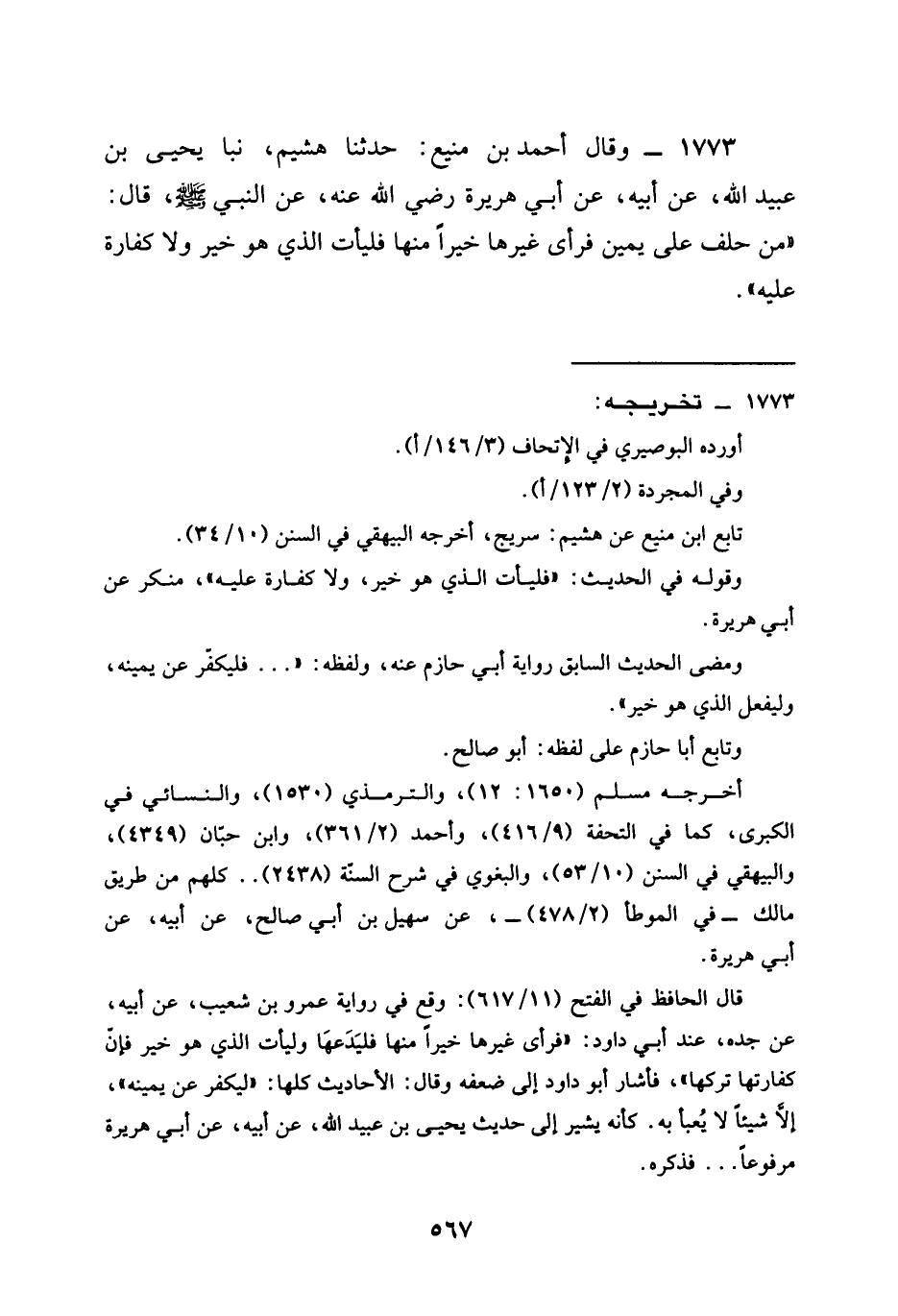 1773 - وَقَالَ أَحْمَدُ بْنُ مَنِيعٍ حدثنا هشيم نبا يحيى بن عبيد اللَّهِ عَنْ أَبِيهِ عَنْ أبي هريرة رَضِيَ الله عَنْه عَنِ النَّبِيِّ صَلَّى اللَّهُ عَلَيْهِ وَسَلَّمَ قَالَ §مَنْ حَلَفَ عَلَى يَمِينٍ فَرَأَى غَيْرَهَا خَيْرًا مِنْهَا فَلْيَأْتِ الَّذِي هُوَ خَيْرٌ وَلَا كَفَّارَةَ عَلَيْهِ