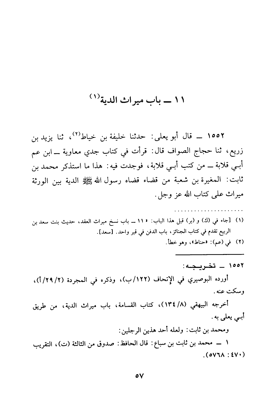1552 - قَالَ أَبُو يَعْلَى حَدَّثَنَا خَلِيفَةُ بْنُ خَيَّاطٍ ثنا يَزِيدُ بْنُ زُرَيْعٍ ثنا حجاج الصواف قال قَرَأْتُ فِي كِتَابِ جَدِّي مُعَاوِيَةَ - ابْنِ عَمِّ أَبِي قِلَابَةَ مِنْ كُتُبِ أَبِي قِلَابَةَ فَوَجَدْتُ فِيهِ هَذَا مَا اسْتَذْكَرَ مُحَمَّدِ بْنِ ثَابِتٍ الْمُغِيرَةَ بْنَ شُعْبَةَ مِنْ قَضَاءٍ قَضَاهُ رَسُولُ اللَّهِ صَلَّى اللَّهُ عَلَيْهِ وَسَلَّمَ §الدِّيَةُ بَيْنَ الْوَرَثَةِ مِيرَاثٌ عَلَى كتاب الله عز وجل