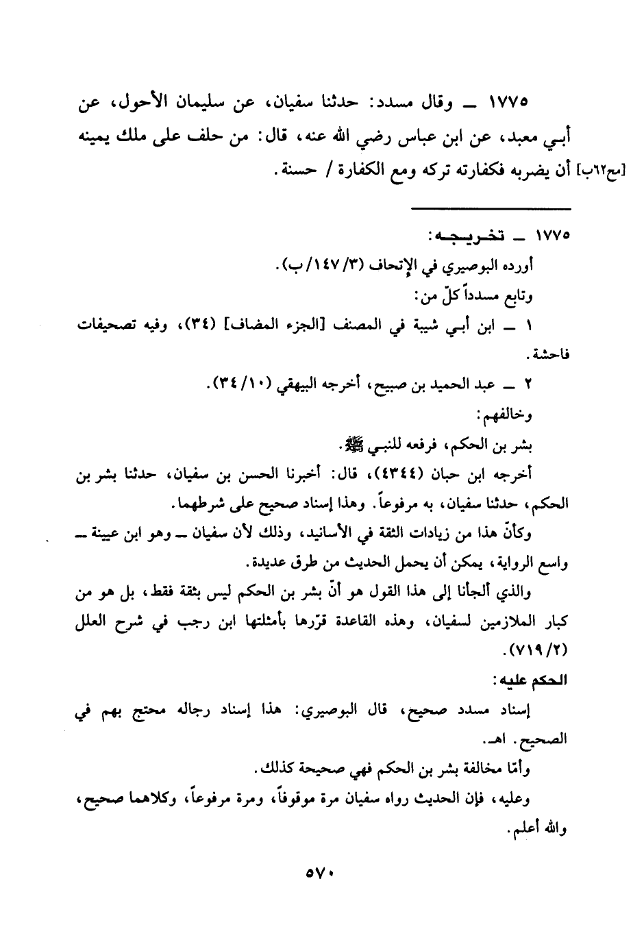 1775 - وَقَالَ مُسَدَّدٌ حَدَّثَنَا سُفْيَانُ عَنْ سُلَيْمَانَ الْأَحْوَلِ عَنْ أَبِي مَعْبَدٍ عَنِ ابن عباس رَضِيَ الله عَنْه قال §مَنْ حَلَفَ عَلَى مِلْكِ يَمِينِهِ أَنْ يَضْرِبَهُ فَكَفَّارَتُهُ تَرْكُهُ وَمَعَ الْكَفَّارَةِ حَسَنَةٌ