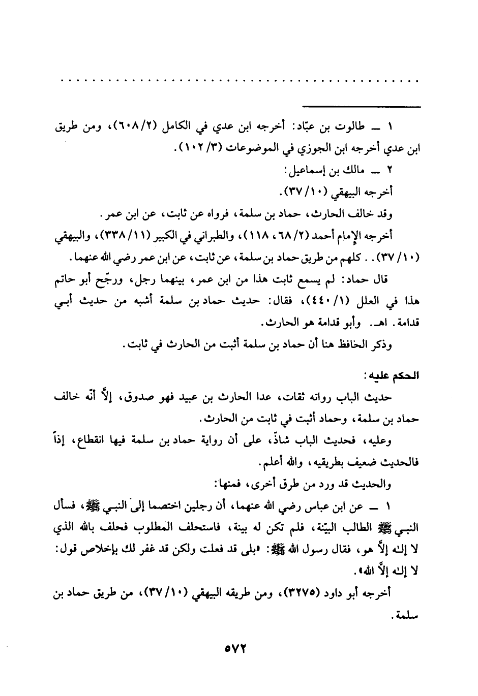 قال حَمَّادٌ: لَمْ يَسْمَعْ ثَابِتٌ هَذَا مِنِ ابْنِ عمر، بينهما رجل، ورجّح أبو حاتم هذا في العلل (1/ 440)، فقال: حديث حماد بن سلمة أشبه من حديث أبي قدامة. اهـ. وأبو قدامة هو الحارث.