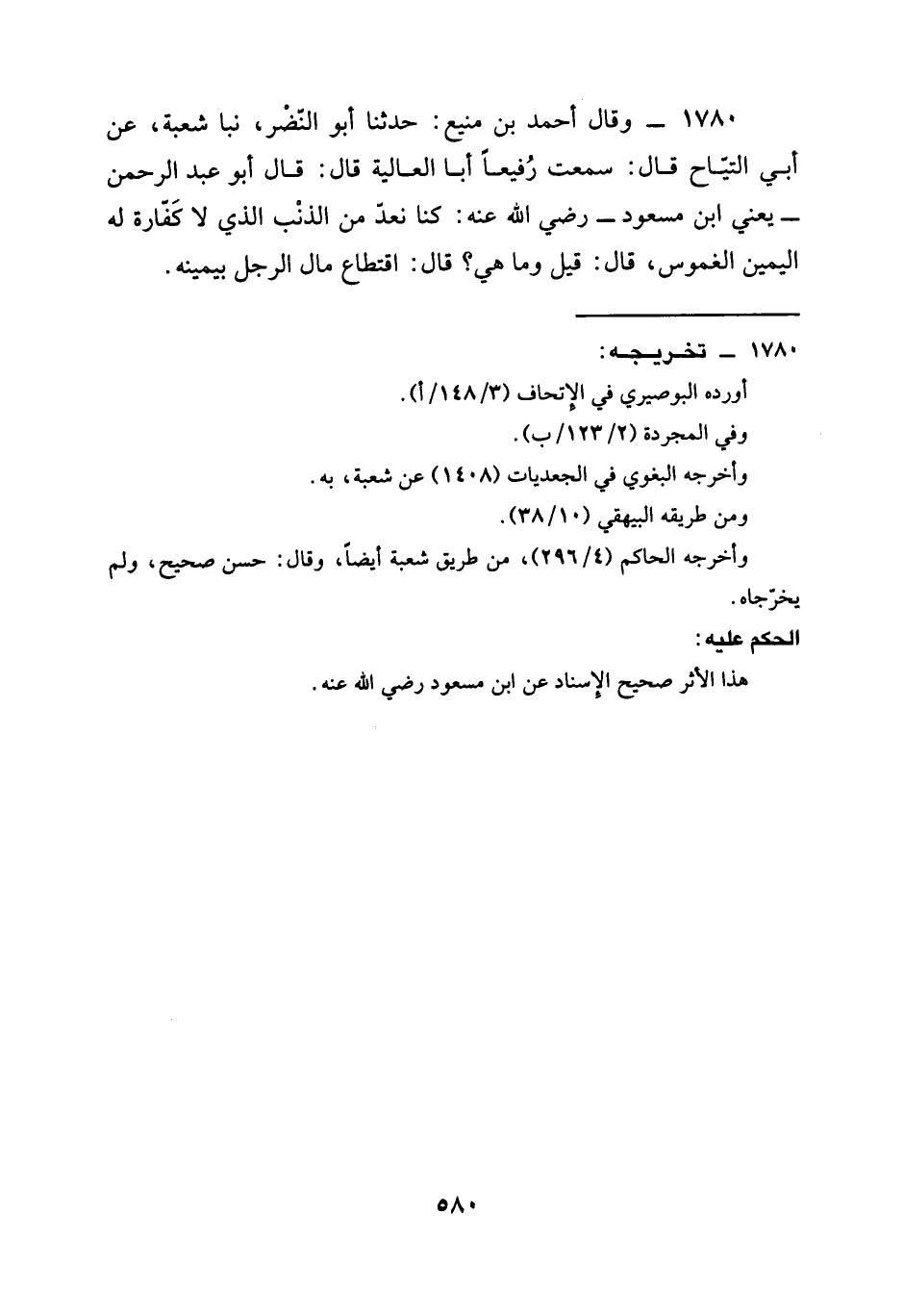 1780 - وَقَالَ أَحْمَدُ بْنُ مَنِيعٍ حَدَّثَنَا أبو النضر نبا شُعْبَةُ عَنْ أَبِي التياح قال سَمِعْتُ رُفَيْعًا أَبَا الْعَالِيَةِ قَالَ قَالَ أَبُو عَبْدِ الرَّحْمَنِ يَعْنِي ابن مسعود رَضِيَ الله عَنْه §كُنَّا نَعُدُّ مِنَ الذَّنْبِ الَّذِي لَا كَفَّارَةَ لَهُ الْيَمِينَ الْغَمُوسَ قَالَ قيل وَمَا هِيَ قَالَ اقْتِطَاعُ مَالَ الرَّجُلِ بِيَمِينِهِ