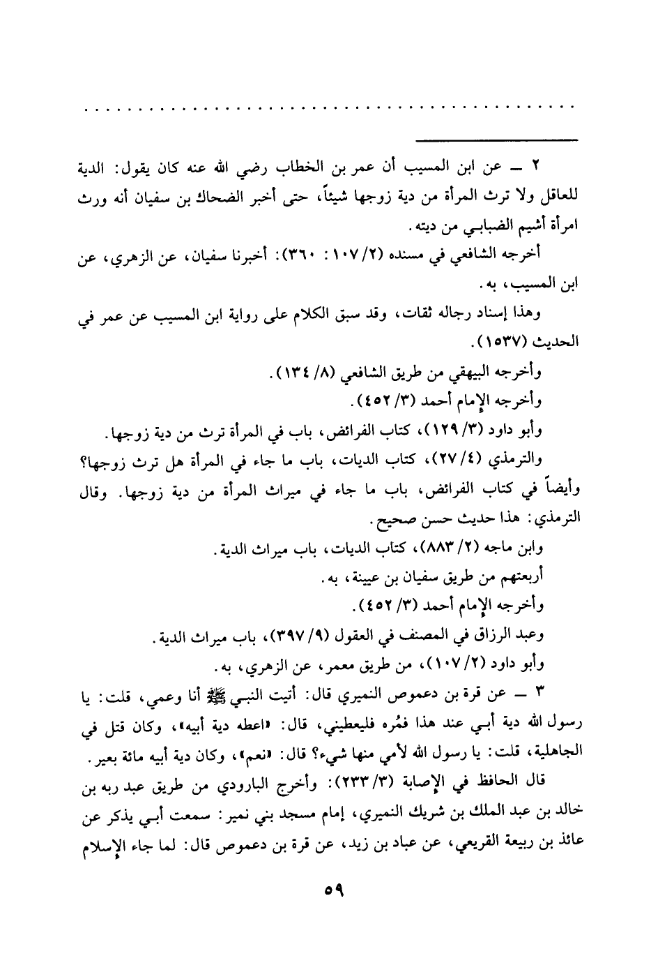 = 2 - عن ابن المسيب إن عمر بن الخطاب رضي الله عنه كان يقول: الدية للعاقل ولا ترث المرأة من دية زوجها شيئًا، حتى أخبر الضحاك بن سفيان أنه ورث امرأة أشيم الضبابي من ديته.