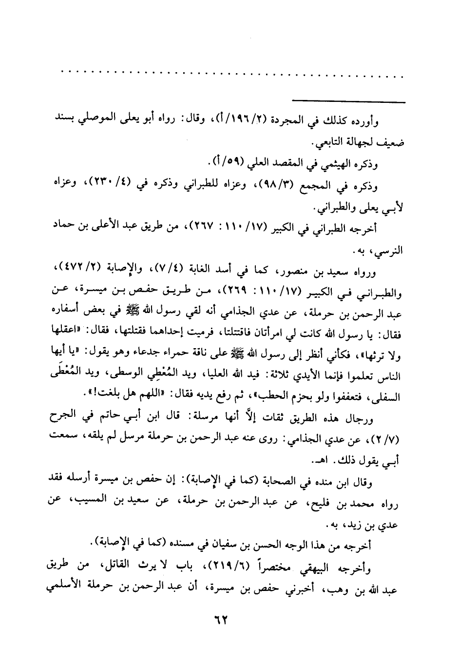 ورواه سعيد بن منصور، كما في أسد الغابة (4/ 7)، والإصابة (2/ 472)، والطبراني في الكبير (17/ 110: 269)، من طريق حفص بن ميسرة، عن عبد الرحمن بن حرملة، عن عدي الجذامي أنه لَقِيَ رَسُولُ اللَّهِ -صَلَّى اللَّهُ عَلَيْهِ وَسَلَّمَ- في بعض أسفاره فقال: يا رسول الله كانت لي امرأتان فاقتتلتا، فرميت إحداهما فقتلتها، فقال: "اعقلها ولا ترثها"، فكأني أَنْظُرُ إِلَى رَسُولِ اللَّهِ -صَلَّى اللَّهُ عَلَيْهِ وسلم- على ناقة حمراء جدعاء وهو يقول: "يا أيها الناس تعلموا فإنما الأيدي ثلاثة: فيد الله الْعُلْيَا، وَيَدُ المُعْطِي الْوُسْطَى، وَيَدُ المُعْطَى السُّفْلَى، فَتَعَفَّفُوا وَلَوْ بِحُزَمِ الْحَطَبِ"، ثُمَّ رَفَعَ يَدَيْهِ فقال: "اللهم هل بلغت! ".