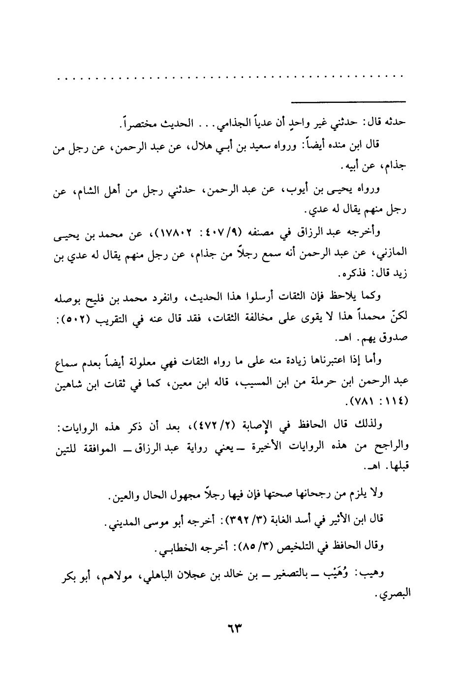 وأخرجه عبد الرزاق في مصنفه (7/ 409: 17802)، عن محمد بن يحيى المازني، عن عبد الرحمن أنه سمع رجلًا مِنْ جُذَامَ، عَنْ رَجُلٍ مِنْهُمْ يُقَالُ لَهُ عدي بن زيد قال: فذكره.