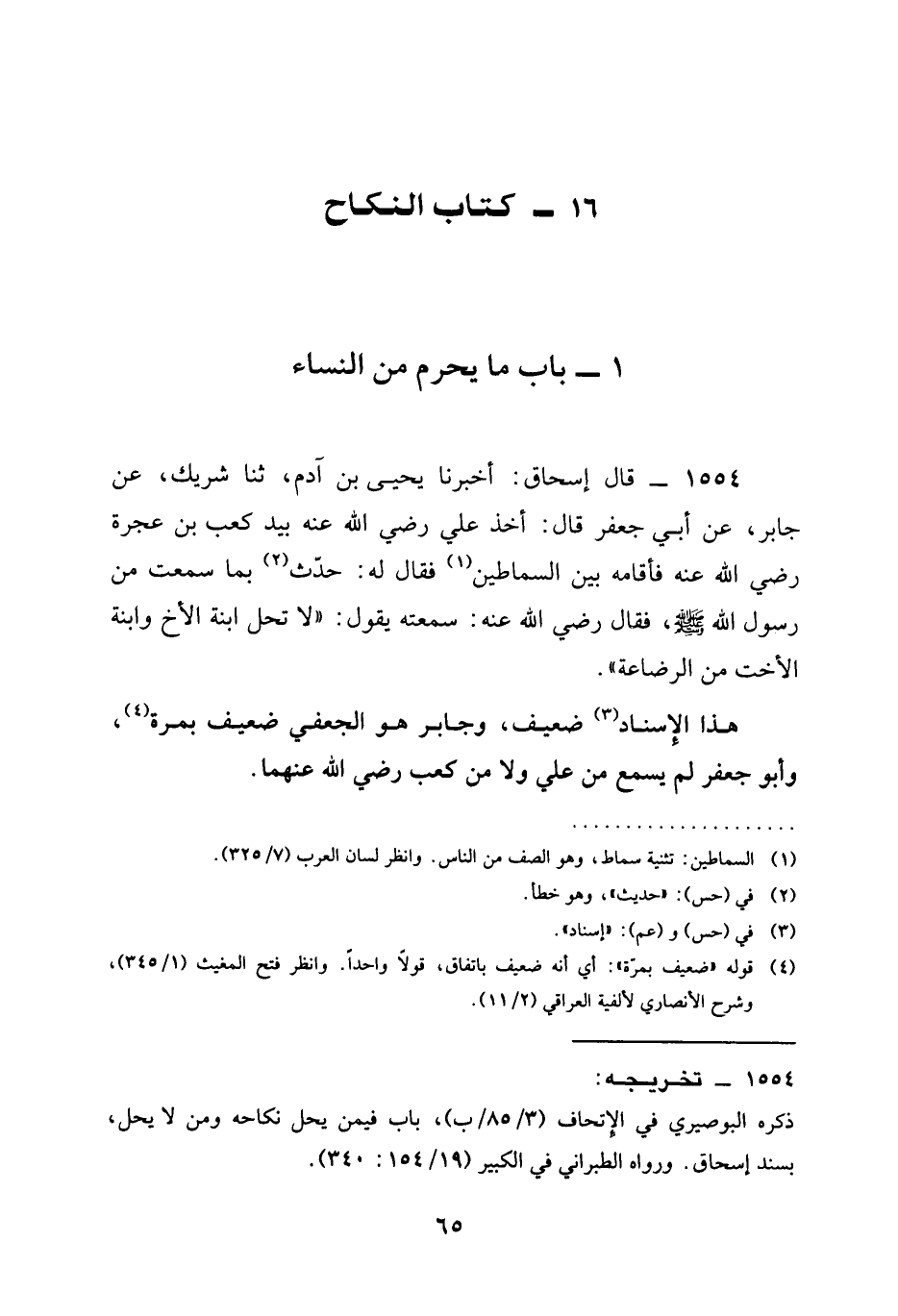 1554 - قَالَ إِسْحَاقُ: أَخْبَرَنَا يَحْيَى بْنُ آدَمَ، ثنا شَرِيكٌ، عَنْ جَابِرٍ، عَنْ أَبِي جَعْفَرٍ قَالَ: أخذ علي رضي الله عنه بيد كعب بن عجرة رضي الله عنه فَأَقَامَهُ بَيْنَ السِّمَاطَيْنِ (¬1) فَقَالَ لَهُ: حَدِّثْ (¬2) بِمَا سَمِعْتَ مِنْ رَسُولِ اللَّهِ -صَلَّى اللَّهُ عليه وسلم-، فقال رضي الله عنه: سَمِعْتُهُ يَقُولُ: "لَا تَحِلُّ ابْنَةُ الْأَخِ وَابْنَةُ الأخت من الرضاعة".