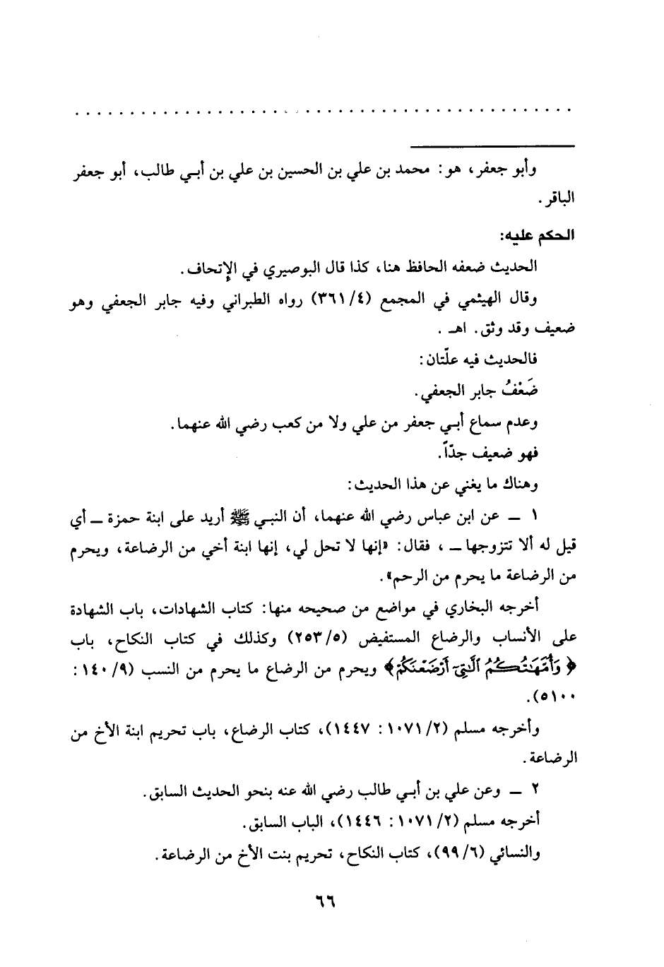 1 - عَنِ ابْنِ عَبَّاسٍ رَضِيَ اللَّهُ عَنْهُمَا، أَنَّ النبي -صلى الله عليه وسلم- أريد على ابنة حمزة -أي قيل له ألا تتزوجها-، فقال: "إنها لا تحل لي، إنها ابنة أخي من الرضاعة، ويحرم من الرضاعة ما يحرم من الرحم".