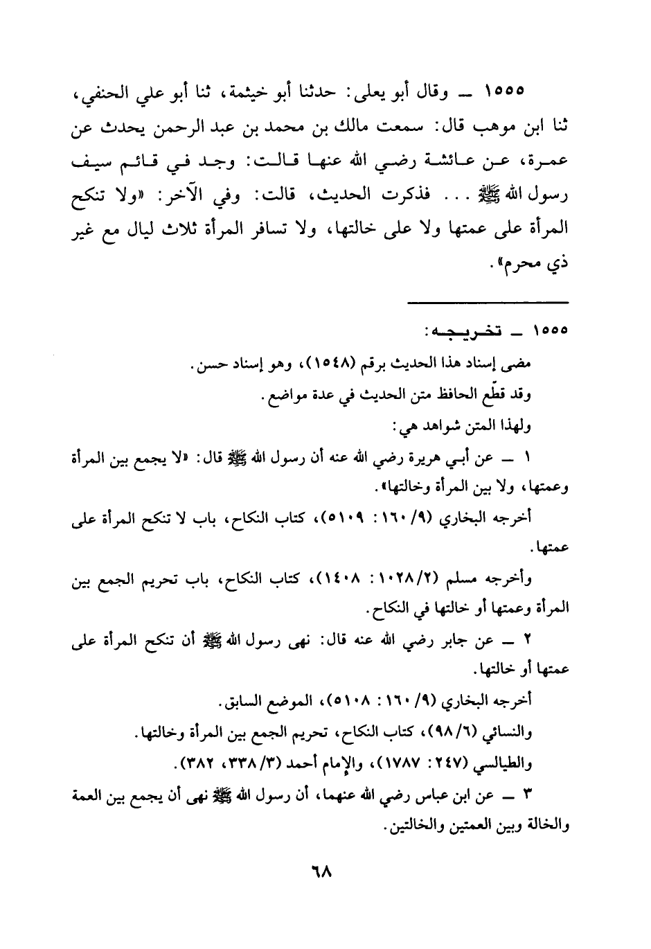 1555 - وَقَالَ أَبُو يَعْلَى حَدَّثَنَا أَبُو خَيْثَمَةَ ثنا أَبُو عَلِيٍّ الْحَنَفِيُّ ثنا ابن موهب قال سَمِعْتُ مَالِكَ بْنَ مُحَمَّدِ بْنِ عَبْدِ الرَّحْمَنِ يُحَدِّثُ عَنْ عَمْرَةَ عن عائشة رَضِيَ الله عَنْها قَالَتْ وُجِدَ فِي قَائِمِ سَيْفِ رَسُولِ اللَّهِ صَلَّى اللَّهُ عَلَيْهِ وَسَلَّمَ ... فَذَكَرَتِ الْحَدِيثَ قَالَتْ وَفِي الْآخِرِ §وَلَا تُنْكَحُ الْمَرْأَةُ عَلَى عَمَّتِهَا وَلَا عَلَى خَالَتِهَا وَلَا تُسَافِرُ الْمَرْأَةُ ثَلَاثَ لَيَالٍ مَعَ غَيْرِ ذِي مَحْرَمٍ