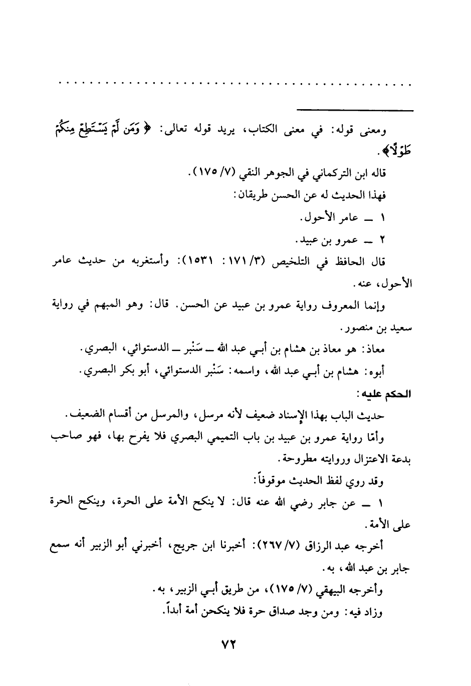 1 - عن جابر رضي الله عنه قال: لا ينكح الأمة على الحرة، وينكح الحرة على الأمة.