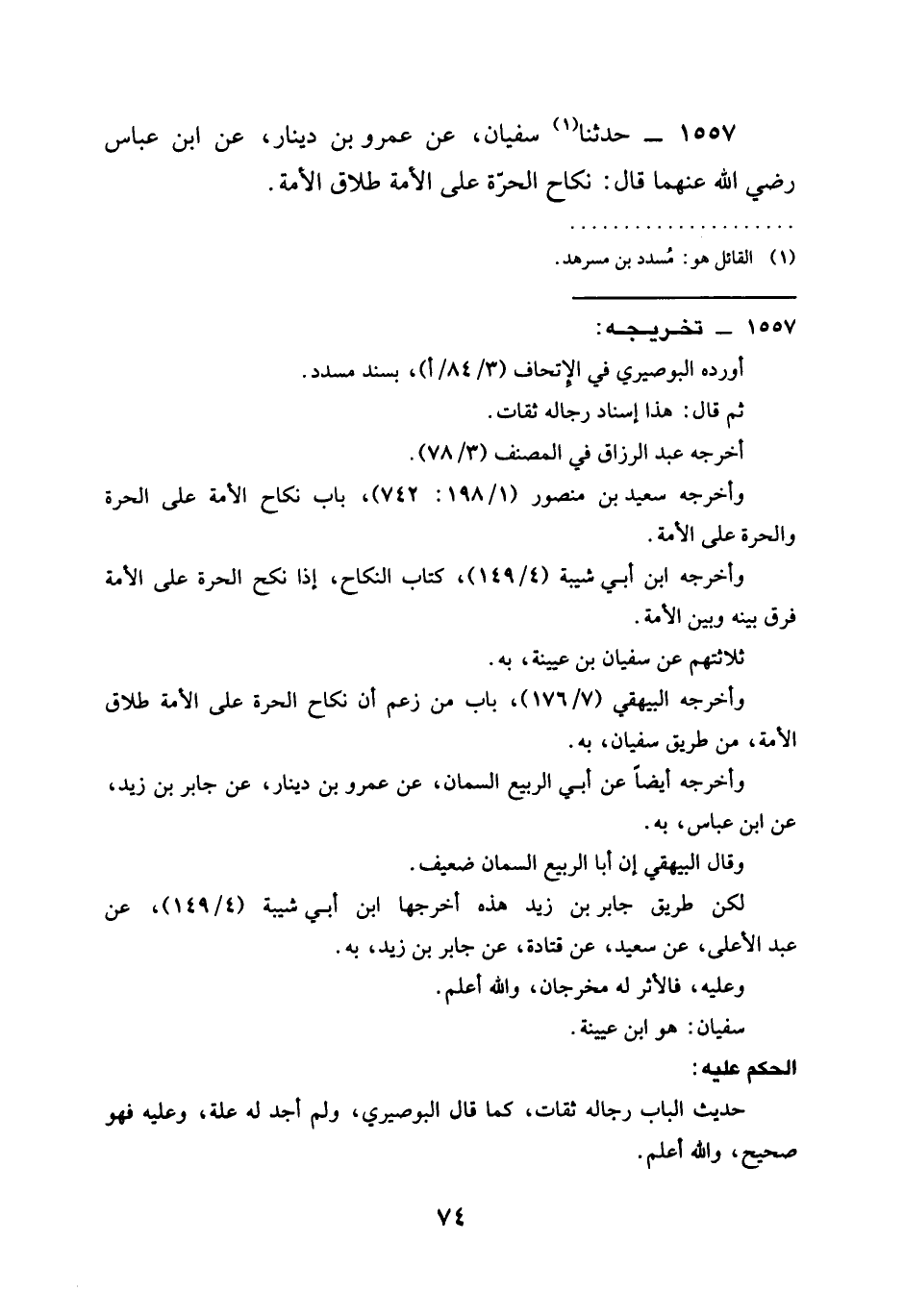 1557 - حَدَّثَنَا سُفْيَانُ عَنْ عَمْرِو بْنِ دِينَارٍ عَنِ ابن عباس رَضِيَ الله عَنْهما قَالَ §نِكَاحُ الْحُرَّةِ عَلَى الْأَمَةِ طَلَاقُ الْأَمَةِ