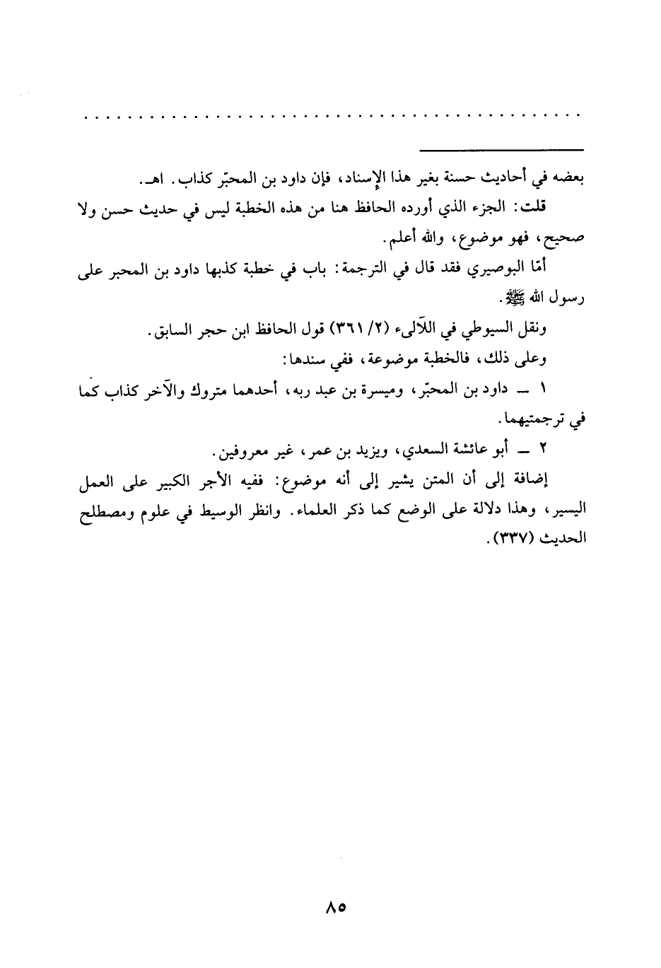 أمّا البوصيري فقد قال في الترجمة: باب في خطبة كذبها داود بن المحبر على رسول الله -صلى الله عليه وسلم-.