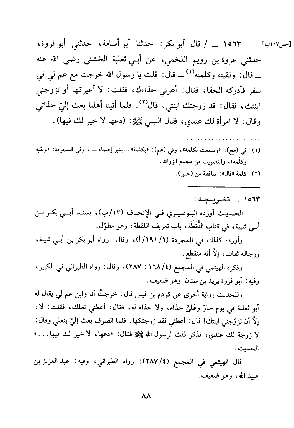 1563 - قال أَبُو بَكْرٍ حدثنا أَبُو أُسَامَةَ حَدَّثَنِي أَبُو فَرْوَةَ حَدَّثَنِي عُرْوَةُ بْنُ رُوَيْمٍ اللَّخْمِيُّ عَنْ أَبِي ثعلبة الخشني رَضِيَ الله عَنْه قَالَ ولقيته وكلمته قَالَ قُلْتُ يَا رَسُولَ اللَّهِ §خَرَجْتُ مَعَ عَمٍّ لِي فِي سَفَرٍ فَأَدْرَكَهُ الحفا فَقَالَ أعرني حذاءك فقلت لَا أُعِيرُكَهَا أَوْ تَزَوَّجَنِي ابْنَتَكَ فَقَالَ قَدْ زَوَّجْتُكَ ابْنَتِي قَالَ فَلَمَّا أَتَيْنَا أَهْلَنَا بَعَثَ إِلَيَّ حِذَائِي وَقَالَ لَا امْرَأَةَ لَكَ عِنْدِي فَقَالَ النَّبِيُّ صَلَّى اللَّهُ عَلَيْهِ وَسَلَّمَ دَعْهَا لَا خَيْرَ لَكَ فِيهَا
