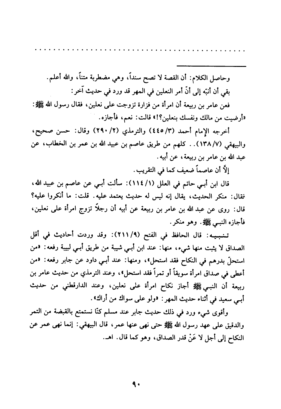 بقي أن أنبّه إلى أنّ أمر النعلين في المهر قد ورد في حديث آخر: