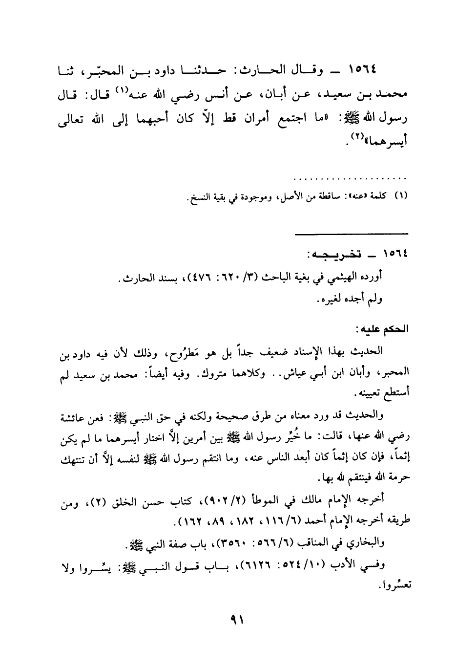 1564 - قال الْحَارِثُ حَدَّثَنَا دَاوُدُ بْنُ الْمُحَبَّرِ ثنا مُحَمَّدُ بْنُ سَعِيدٍ عَنْ أَبَانَ عن انس رَضِيَ الله عَنْه قَالَ قَالَ رَسُولُ اللَّهِ صَلَّى اللَّهُ عَلَيْهِ وَسَلَّمَ §مَا اجْتَمَعَ أَمْرَانِ قَطُّ إِلَّا كَانَ أَحَبَّهُمَا إلى الله تعالى أَيْسَرُهُمَا