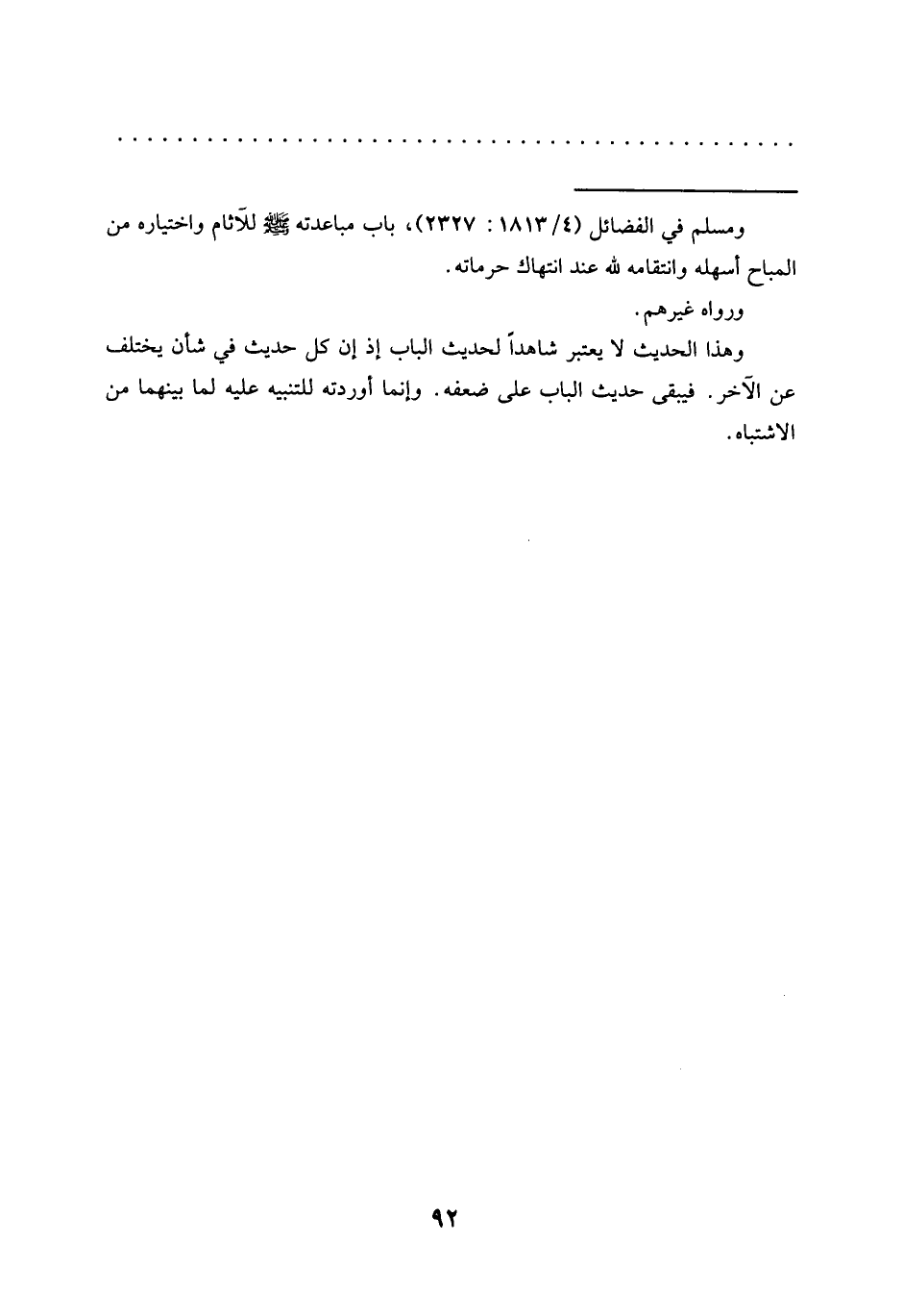 وهذا الحديث لا يعتبر شاهدًا لحديث الباب إذ إن كل حديث في شأن يختلف عن الآخر. فيبقى حديث الباب على ضعفه. وإنما أوردته للتنبيه عليه لما بينهما من الاشتباه.