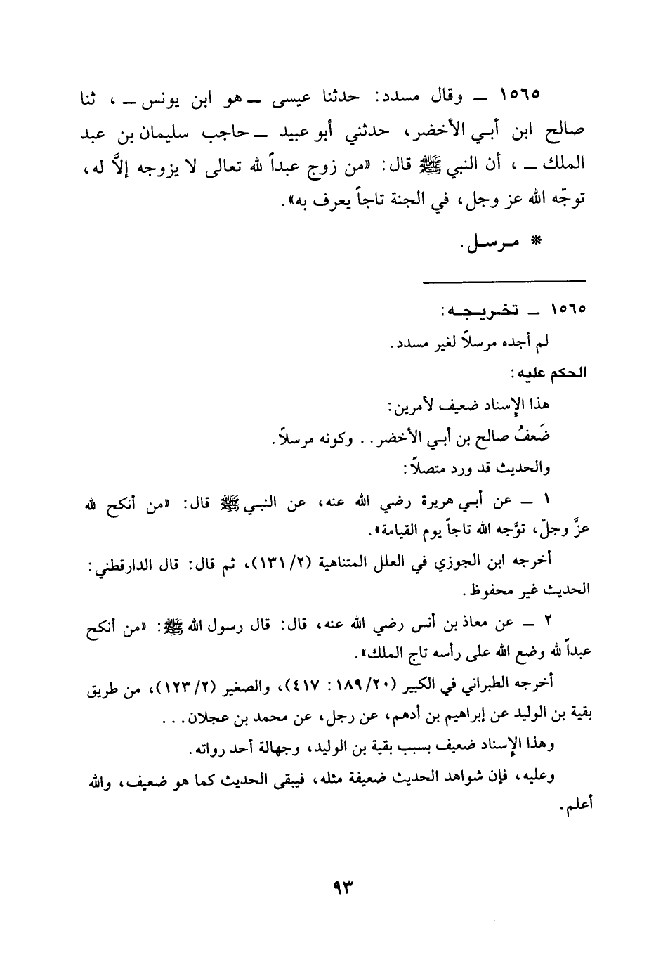 1565 - قال مُسَدَّدٌ حدثنا عِيسَى هُوَ ابْنُ يُونُسَ ثنا صَالِحُ ابن أَبِي الْأَخْضَرِ حَدَّثَنِي أَبُو عُبَيْدٍ حَاجِبُ سُلَيْمَانَ بْنِ عَبْدِ الْمَلِكِ أَنَّ النَّبِيَّ صَلَّى اللَّهُ عَلَيْهِ وَسَلَّمَ قَالَ §مَنْ زَوَّجَ عبدا لله تعالى لَا يُزَوِّجُهُ إِلَّا لَهُ توجه الله عز وجل في الجنة تَاجًا يُعْرَفُ بِهِ