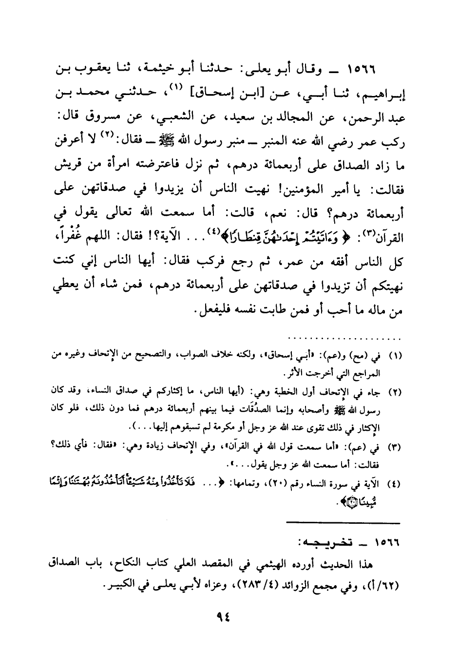 1566 - وَقَالَ أَبُو يَعْلَى حَدَّثَنَا أَبُو خَيْثَمَةَ ثنا يَعْقُوبُ بْنُ إِبْرَاهِيمَ ثنا أَبِي عَنْ ابْنِ إِسْحَاقَ حَدَّثَنِي مُحَمَّدُ بْنُ عَبْدِ الرَّحْمَنِ عَنِ الْمُجَالِدِ بْنِ سَعِيدٍ عَنِ الشَّعْبِيِّ عَنْ مَسْرُوقٍ قَالَ ركب عمر رَضِيَ الله عَنْه الْمِنْبَرَ مِنْبَرَ رَسُولِ اللَّهِ صَلَّى اللَّهُ عَلَيْهِ وَسَلَّمَ فَقَالَ لَا أَعْرِفَنَّ مَا زَادَ الصَّدَاقُ عَلَى أَرْبَعِمِائَةِ دِرْهَمٍ ثُمَّ نَزَلَ فَاعْتَرَضَتْهُ امرأة من فريش فقال يَا أَمِيرَ الْمُؤْمِنِينَ نَهَيْتَ النَّاسَ أَنْ يَزِيدُوا في صدقاتهن إلى أربعمائة دِرْهَمٍ قَالَ نَعَمْ قَالَتْ أَمَا سمعت الله تعالى يَقُولُ فِي الْقُرْآنِ {وآتيتهم إِحْدَاهُنَّ قِنْطَارًا} الْآيَةَ فَقَالَ اللَّهُمَّ غَفْرًا كُلُّ النَّاسِ أَفْقَهُ مِنْ عُمَرَ ثُمَّ رَجَعَ فَرَكِبَ فَقَالَ أَيُّهَا النَّاسُ إِنِّي §كُنْتُ نَهَيْتُكُمْ أَنْ تَزِيدُوا فِي صَدُقَاتِهِنِّ عَلَى أَرْبَعِمِائَةِ دِرْهَمٍ فَمَنْ شَاءَ أَنْ يُعْطِيَ مِنْ مَالِهِ مَا أَحَبَّ أَوْ فَمَنْ طَابَتْ نَفْسُهُ فَلْيَفْعَلْ