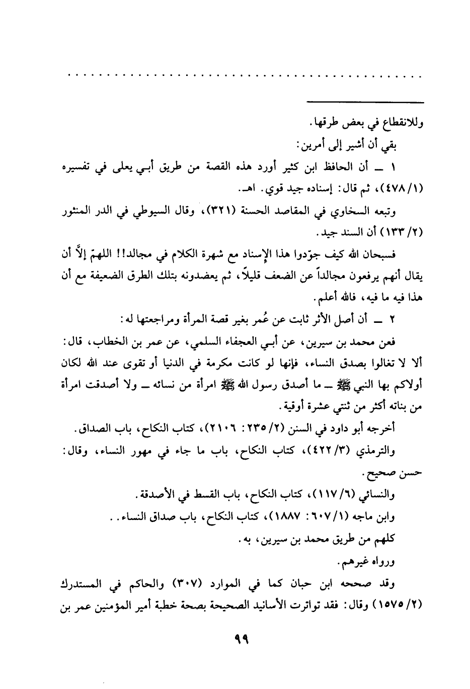 2 - أن أجل الأثر ثابت عن عُمر بغير قصة المرأة ومراجعتها له: فعن محمد بن سيرين، عن أبي العجفاء السلمي، عن عمر بن الخطاب، قال: ألا لا تغالوا بصدق النساء، فإنها لو كانت مكرمة في الدنيا أو تقوى عند الله لكان أولاكم بها النبي -صلي الله عليه وسلم-ما أصدق رَسُولَ اللَّهِ -صَلَّى اللَّهُ عَلَيْهِ وَسَلَّمَ- امْرَأَةٌ من نسائه- ولا أصدقت امرأة من بناته أكثر من ثنتي عشرة أوقية.